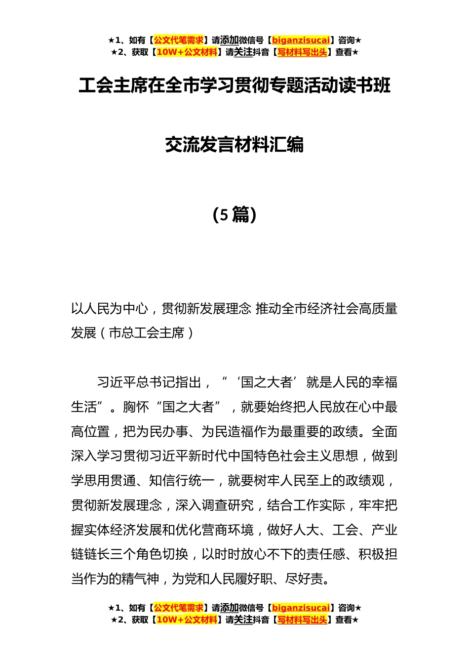 ★1、如有【公文代笔需求】请添加微信号【biganzisucai】咨询★★2、获取【10W+公文材料】请关注抖音【写材料写出头】查看★工会主席在全市学习贯彻专题活动读书班交流发言材料汇编(5篇)以人民为中心,贯彻新发展理念推动全市经济社会高质量发展(市总工会主席)习近平总书记指出,“‘国之大者’就是人民的幸福生活”。胸怀“国之大者”,就要始终把人民放在心中最高位置,把为民办事、为民造福作为最重要的政绩。全面深入学习贯彻习近平新时代中国特色社会主义思想,做到学思用贯通、知信行统一,就要树牢人民至上的政绩观,贯彻新发展理念,深入调查研究,结合工作实际,牢牢把握实体经济发展和优化营商环境,做好人大、工会、产业链链长三个角色切换,以时时放心不下的责任感、积极担当作为的精气神,为党和...