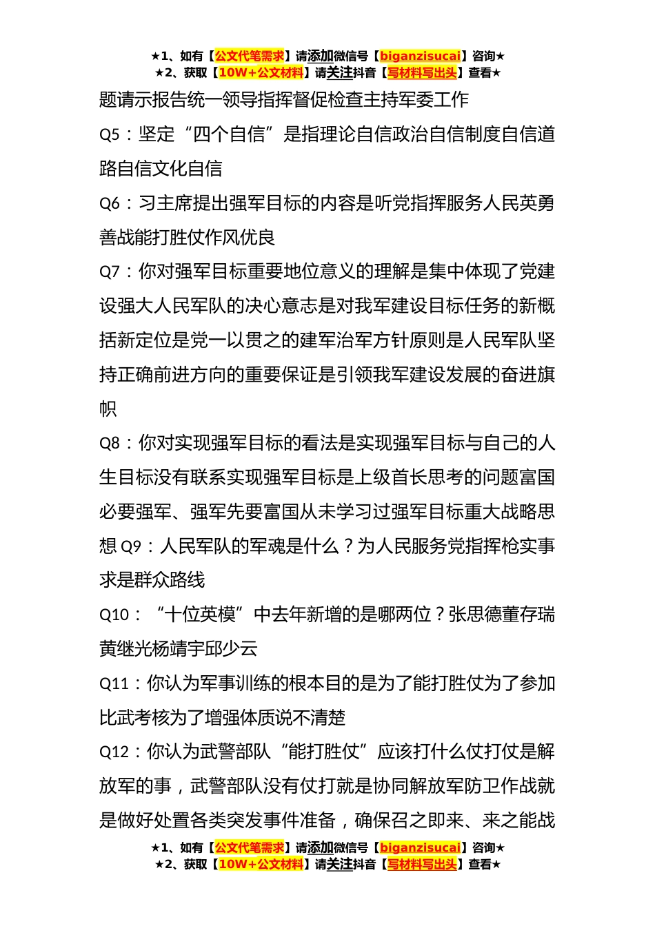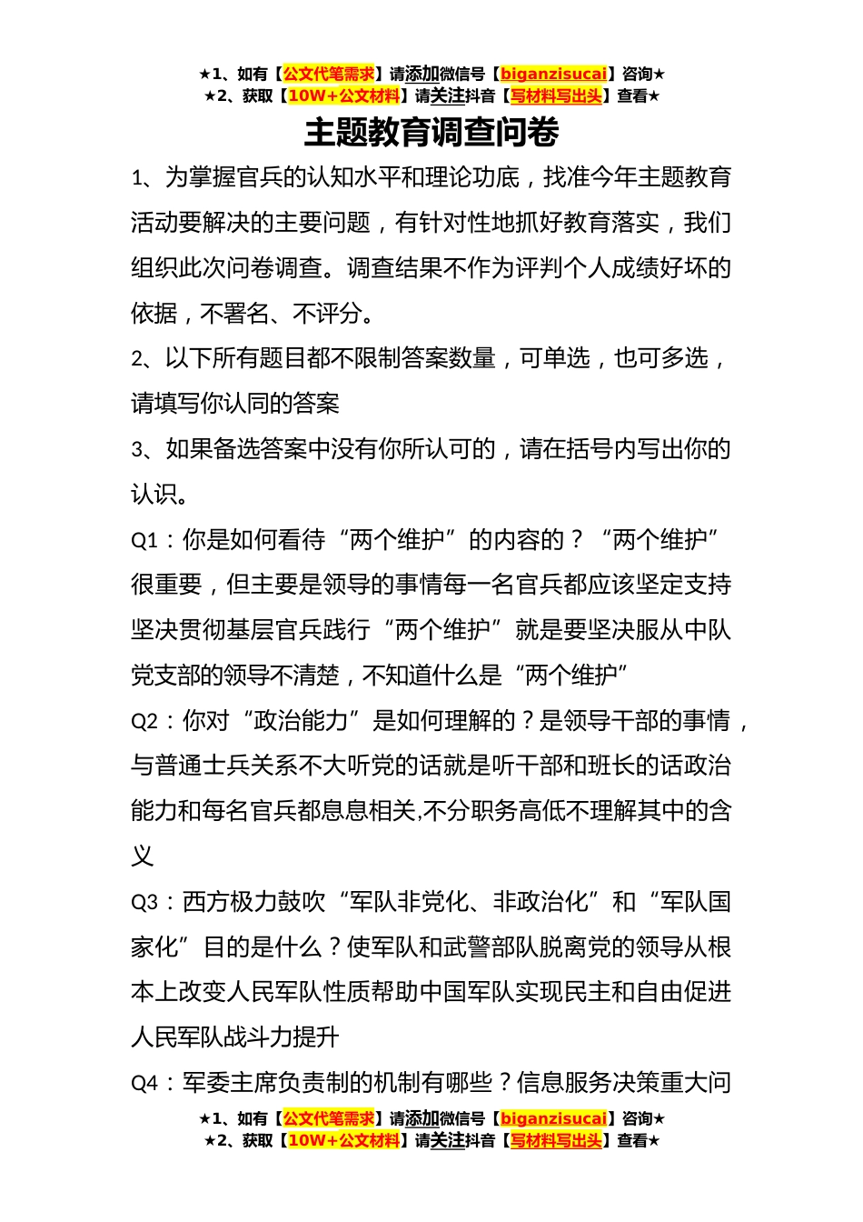 ★1、如有【公文代笔需求】请添加微信号【biganzisucai】咨询★★2、获取【10W+公文材料】请关注抖音【写材料写出头】查看★主题教育调查问卷1、为掌握官兵的认知水平和理论功底,找准今年主题教育活动要解决的主要问题,有针对性地抓好教育落实,我们组织此次问卷调查。调查结果不作为评判个人成绩好坏的依据,不署名、不评分。2、以下所有题目都不限制答案数量,可单选,也可多选,请填写你认同的答案3、如果备选答案中没有你所认可的,请在括号内写出你的认识。Q1:你是如何看待“两个维护”的内容的?“两个维护”很重要,但主要是领导的事情每一名官兵都应该坚定支持坚决贯彻基层官兵践行“两个维护”就是要坚决服从中队党支部的领导不清楚,不知道什么是“两个维护”Q2:你对“政治能力”是如何理解的?是领...