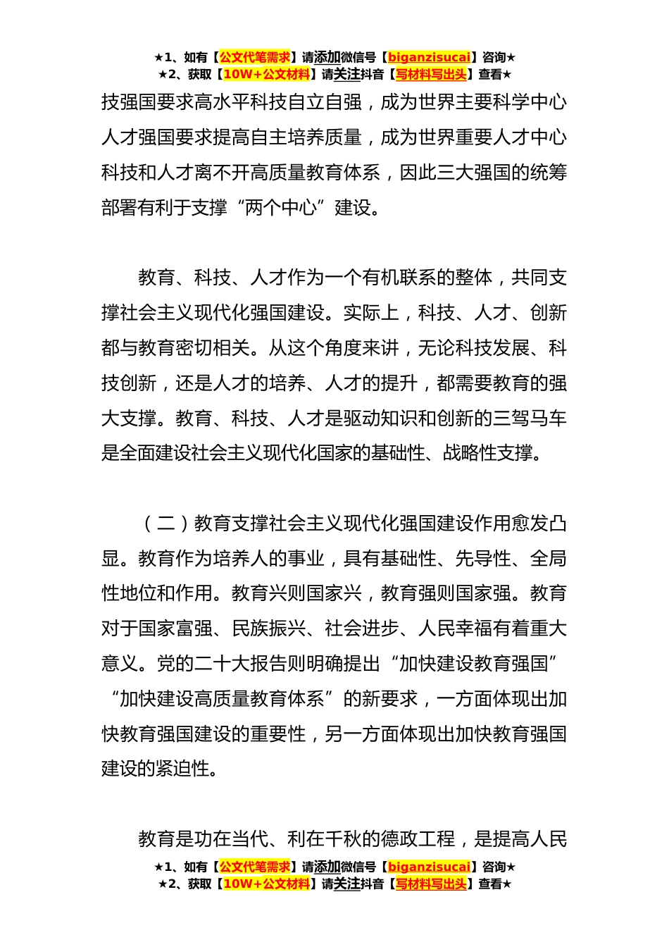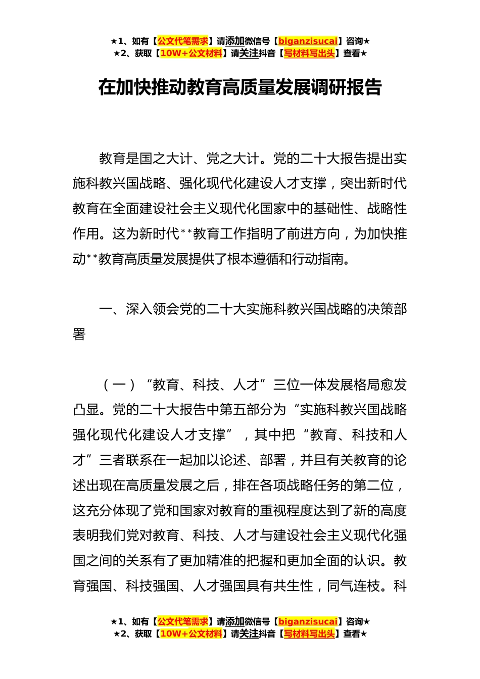 ★1、如有【公文代笔需求】请添加微信号【biganzisucai】咨询★★2、获取【10W+公文材料】请关注抖音【写材料写出头】查看★在加快推动教育高质量发展调研报告教育是国之大计、党之大计。党的二十大报告提出实施科教兴国战略、强化现代化建设人才支撑,突出新时代教育在全面建设社会主义现代化国家中的基础性、战略性作用。这为新时代**教育工作指明了前进方向,为加快推动**教育高质量发展提供了根本遵循和行动指南。一、深入领会党的二十大实施科教兴国战略的决策部署(一)“教育、科技、人才”三位一体发展格局愈发凸显。党的二十大报告中第五部分为“实施科教兴国战略强化现代化建设人才支撑”,其中把“教育、科技和人才”三者联系在一起加以论述、部署,并且有关教育的论述出现在高质量发展之后,排在各项...