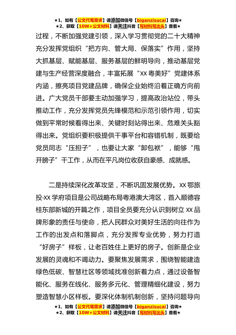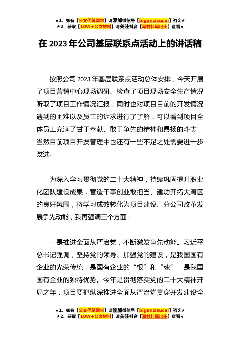 ★1、如有【公文代笔需求】请添加微信号【biganzisucai】咨询★★2、获取【10W+公文材料】请关注抖音【写材料写出头】查看★在2023年公司基层联系点活动上的讲话稿按照公司2023年基层联系点活动总体安排,今天开展了项目营销中心现场调研、检查了项目现场安全生产情况听取了项目工作情况汇报,同时也对项目目前的开发情况遇到的困难以及员工的诉求进行了了解,可以看到项目全体员工充满了甘于奉献、敢于争先的精神和昂扬的斗志,当然目前项目开发管理中也还有一些不足之处需要进一步改进。为深入学习贯彻党的二十大精神,持续巩固提升职业化团队建设成果,营造干事创业敢担当、建功开拓大湾区的良好氛围,将学习成效转化为项目建设、分公司改革发展争先动能,我再强调三个方面:一是推进全面从严治党,不断激发争...
