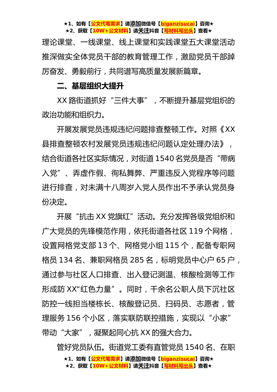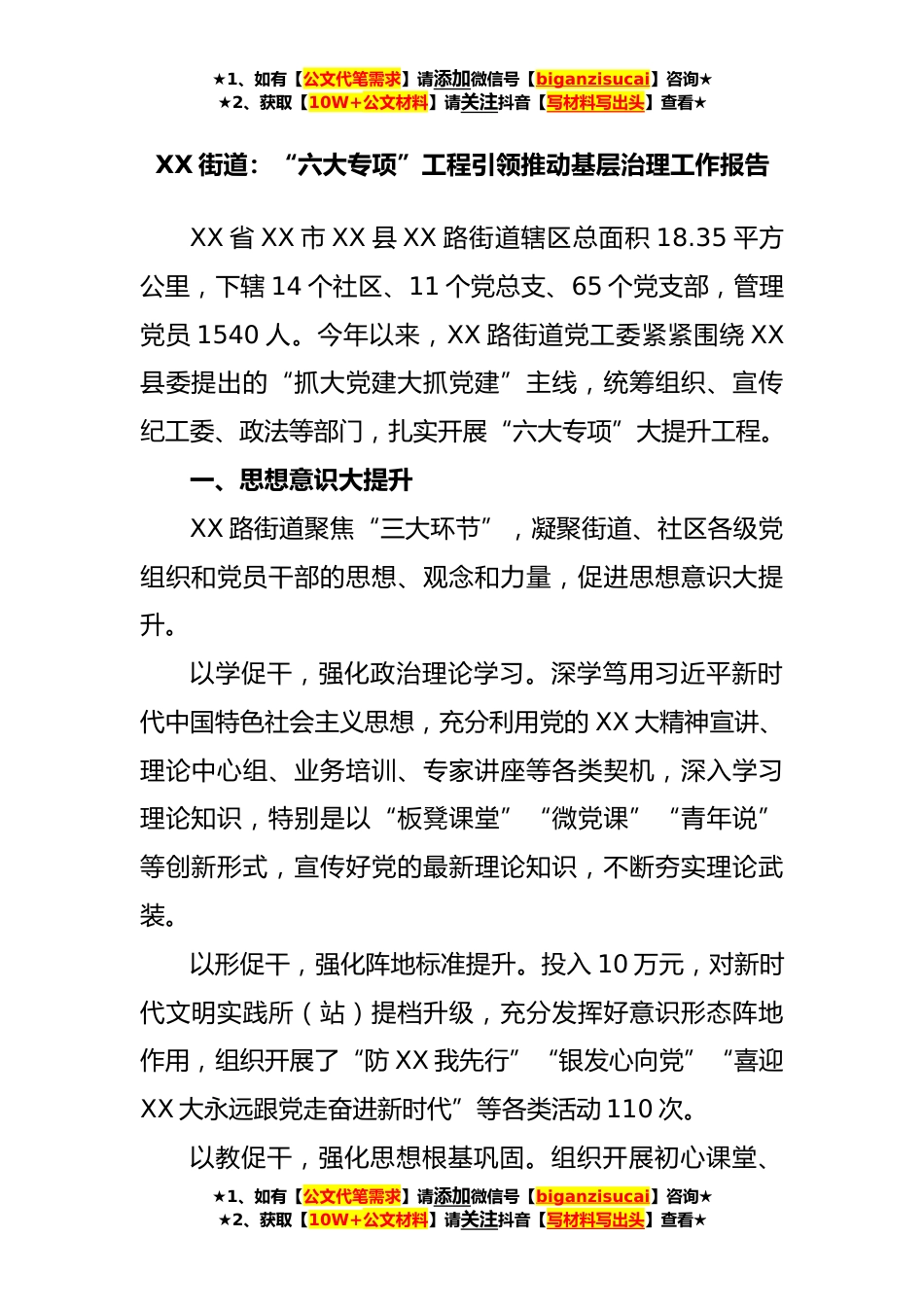 ★1、如有【公文代笔需求】请添加微信号【biganzisucai】咨询★★2、获取【10W+公文材料】请关注抖音【写材料写出头】查看★XX街道:“六大专项”工程引领推动基层治理工作报告XX省XX市XX县XX路街道辖区总面积18.35平方公里,下辖14个社区、11个党总支、65个党支部,管理党员1540人。今年以来,XX路街道党工委紧紧围绕XX县委提出的“抓大党建大抓党建”主线,统筹组织、宣传纪工委、政法等部门,扎实开展“六大专项”大提升工程。一、思想意识大提升XX路街道聚焦“三大环节”,凝聚街道、社区各级党组织和党员干部的思想、观念和力量,促进思想意识大提升。以学促干,强化政治理论学习。深学笃用习近平新时代中国特色社会主义思想,充分利用党的XX大精神宣讲、理论中心组、业务培训、专家讲座等各类契机,深入学习...