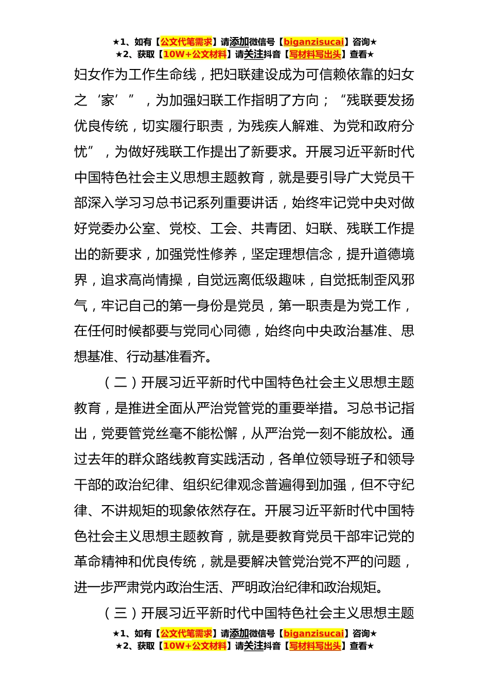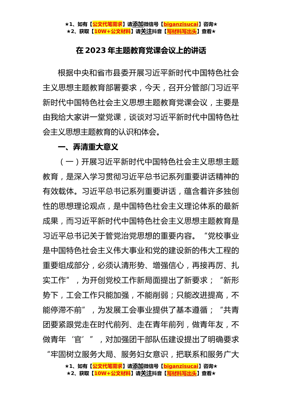 ★1、如有【公文代笔需求】请添加微信号【biganzisucai】咨询★★2、获取【10W+公文材料】请关注抖音【写材料写出头】查看★在2023年主题教育党课会议上的讲话根据中央和省市县委开展习近平新时代中国特色社会主义思想主题教育部署要求,今天,召开分管部门习近平新时代中国特色社会主义思想主题教育党课会议,主要是由我给大家讲一堂党课,谈谈对习近平新时代中国特色社会主义思想主题教育的认识和体会。一、弄清重大意义(一)开展习近平新时代中国特色社会主义思想主题教育,是深入学习贯彻习近平总书记系列重要讲话精神的有效载体。习近平总书记系列重要讲话,蕴含着许多独创性的思想理论观点,是中国特色社会主义理论体系的最新成果,而习近平新时代中国特色社会主义思想主题教育是习近平总书记关于管党治党...