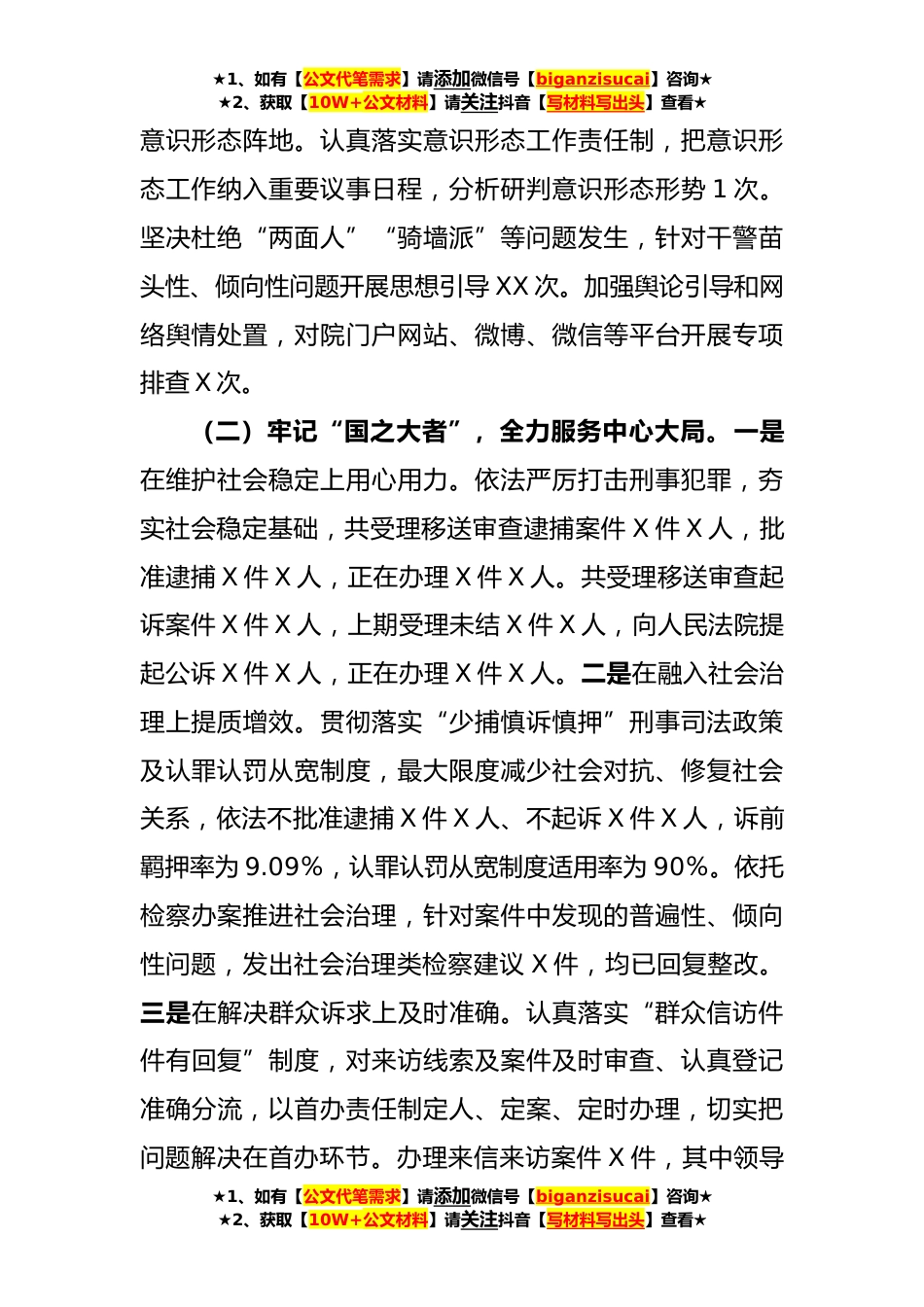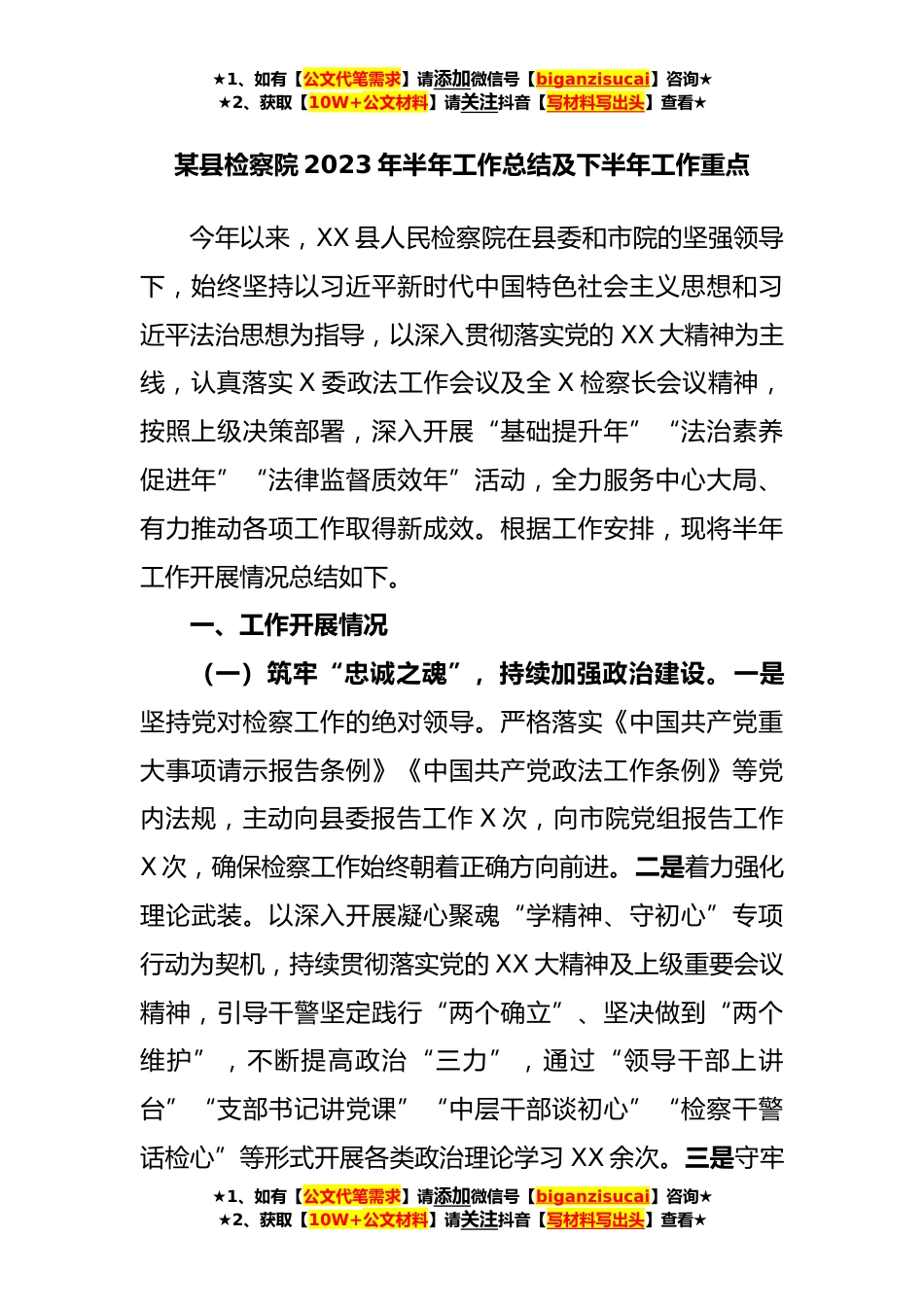 ★1、如有【公文代笔需求】请添加微信号【biganzisucai】咨询★★2、获取【10W+公文材料】请关注抖音【写材料写出头】查看★某县检察院2023年半年工作总结及下半年工作重点今年以来,XX县人民检察院在县委和市院的坚强领导下,始终坚持以习近平新时代中国特色社会主义思想和习近平法治思想为指导,以深入贯彻落实党的XX大精神为主线,认真落实X委政法工作会议及全X检察长会议精神,按照上级决策部署,深入开展“基础提升年”“法治素养促进年”“法律监督质效年”活动,全力服务中心大局、有力推动各项工作取得新成效。根据工作安排,现将半年工作开展情况总结如下。一、工作开展情况(一)筑牢“忠诚之魂”,持续加强政治建设。一是坚持党对检察工作的绝对领导。严格落实《中国共产党重大事项请示报告条例》《中...