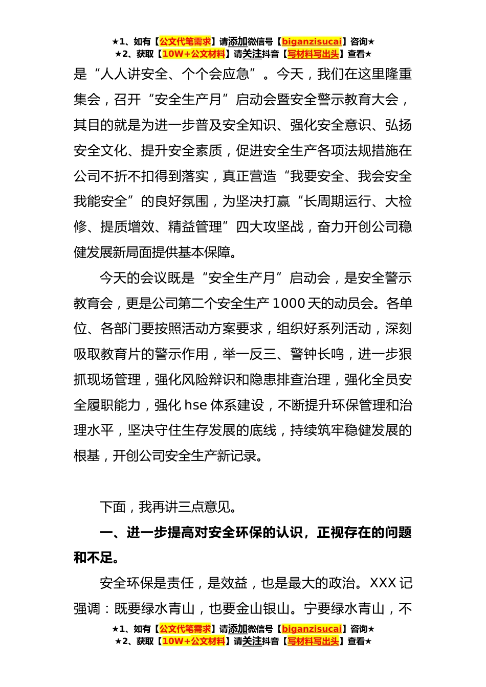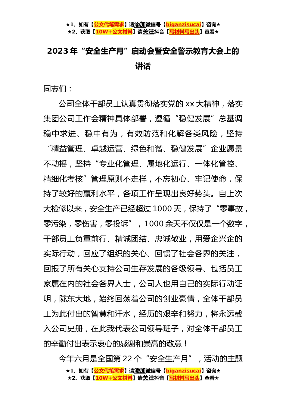 ★1、如有【公文代笔需求】请添加微信号【biganzisucai】咨询★★2、获取【10W+公文材料】请关注抖音【写材料写出头】查看★2023年“安全生产月”启动会暨安全警示教育大会上的讲话同志们:公司全体干部员工认真贯彻落实党的xx大精神,落实集团公司工作会精神具体部署,遵循“稳健发展”总基调稳中求进、稳中有为,有效防范和化解各类风险,坚持“精益管理、卓越运营、绿色和谐、稳健发展”企业愿景不动摇,坚持“专业化管理、属地化运行、一体化管控、精细化考核”管理原则不走样,不忘初心、牢记使命,保持了较好的赢利水平,各项工作呈现出良好势头。自上次大检修以来,安全生产已经超过1000天,保持了“零事故,零污染,零伤害,零投诉”,1000余天不仅仅是一个数字,干部员工负重前行、精诚团结、忠诚敬业,...