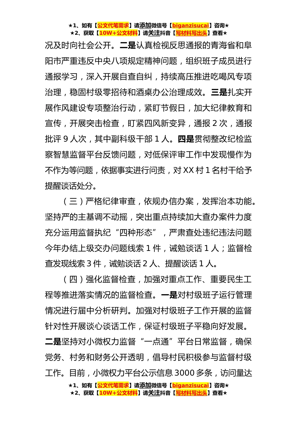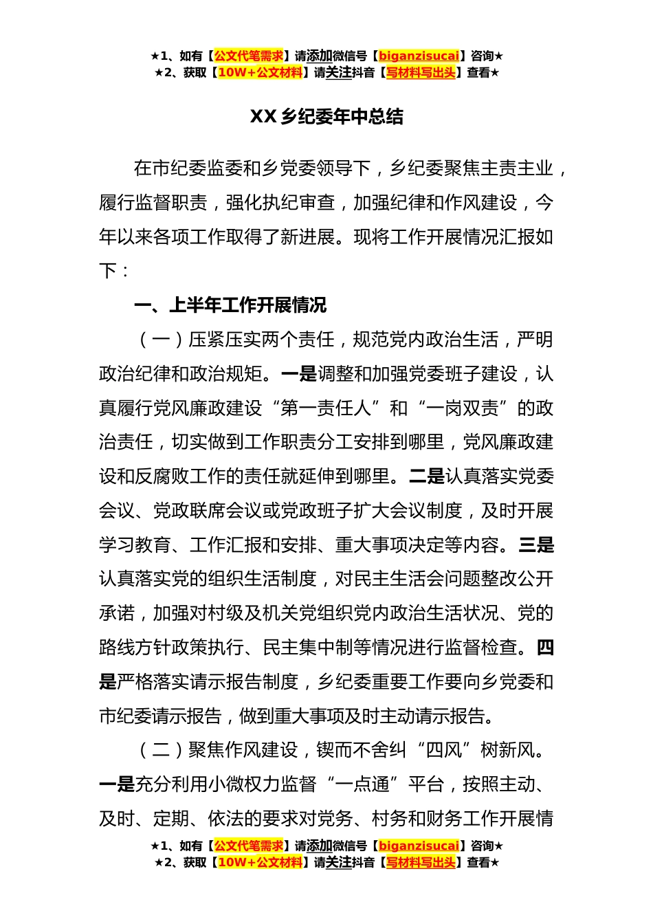 ★1、如有【公文代笔需求】请添加微信号【biganzisucai】咨询★★2、获取【10W+公文材料】请关注抖音【写材料写出头】查看★XX乡纪委年中总结在市纪委监委和乡党委领导下,乡纪委聚焦主责主业,履行监督职责,强化执纪审查,加强纪律和作风建设,今年以来各项工作取得了新进展。现将工作开展情况汇报如下:一、上半年工作开展情况(一)压紧压实两个责任,规范党内政治生活,严明政治纪律和政治规矩。一是调整和加强党委班子建设,认真履行党风廉政建设“第一责任人”和“一岗双责”的政治责任,切实做到工作职责分工安排到哪里,党风廉政建设和反腐败工作的责任就延伸到哪里。二是认真落实党委会议、党政联席会议或党政班子扩大会议制度,及时开展学习教育、工作汇报和安排、重大事项决定等内容。三是认真落实党...