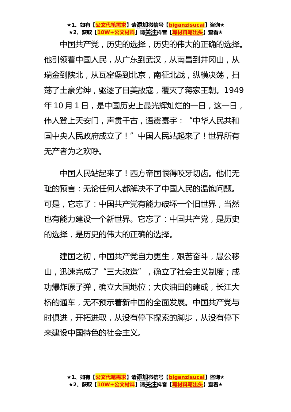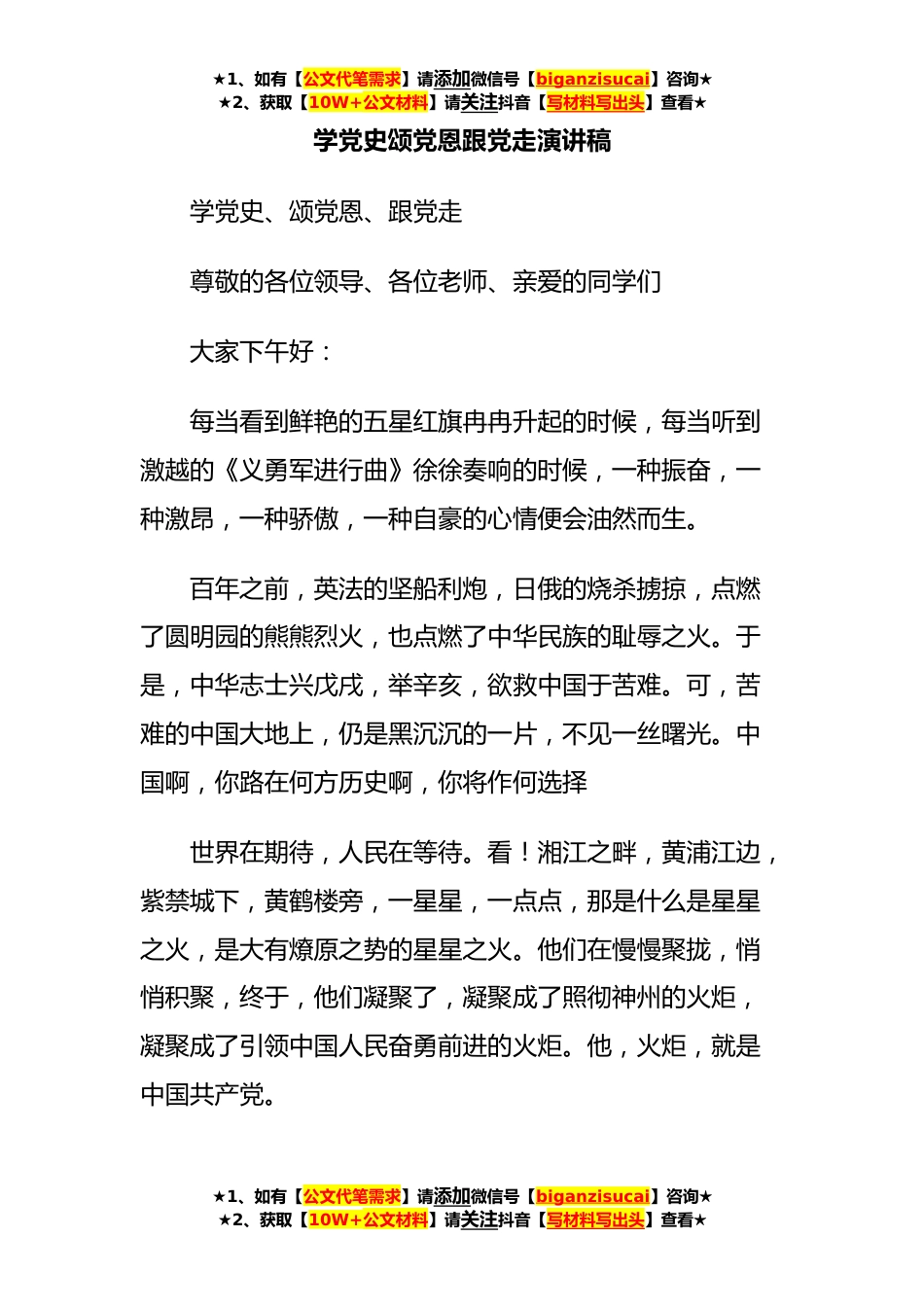 ★1、如有【公文代笔需求】请添加微信号【biganzisucai】咨询★★2、获取【10W+公文材料】请关注抖音【写材料写出头】查看★学党史颂党恩跟党走演讲稿学党史、颂党恩、跟党走尊敬的各位领导、各位老师、亲爱的同学们大家下午好:每当看到鲜艳的五星红旗冉冉升起的时候,每当听到激越的《义勇军进行曲》徐徐奏响的时候,一种振奋,一种激昂,一种骄傲,一种自豪的心情便会油然而生。百年之前,英法的坚船利炮,日俄的烧杀掳掠,点燃了圆明园的熊熊烈火,也点燃了中华民族的耻辱之火。于是,中华志士兴戊戌,举辛亥,欲救中国于苦难。可,苦难的中国大地上,仍是黑沉沉的一片,不见一丝曙光。中国啊,你路在何方历史啊,你将作何选择世界在期待,人民在等待。看!湘江之畔,黄浦江边,紫禁城下,黄鹤楼旁,一星星,...