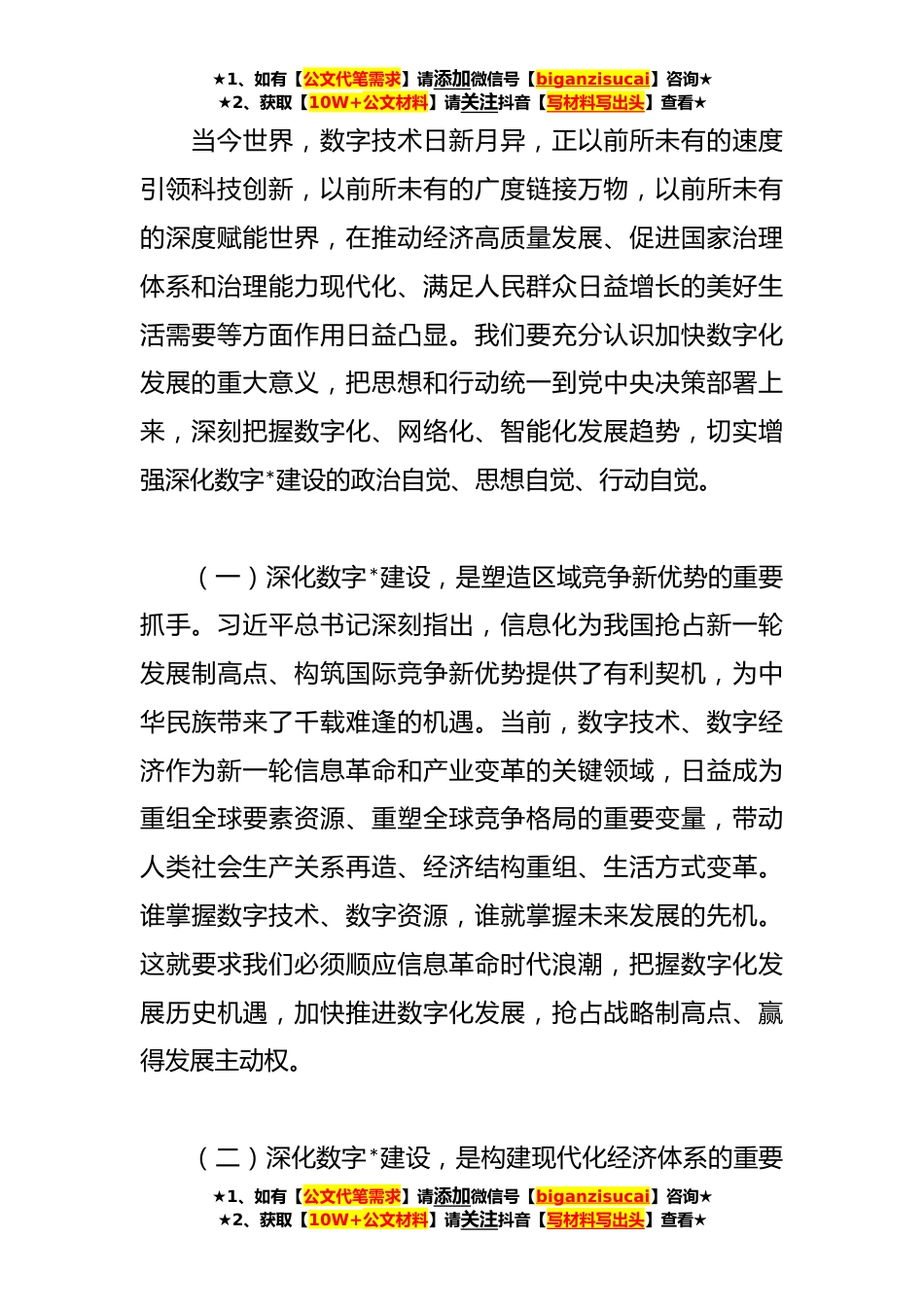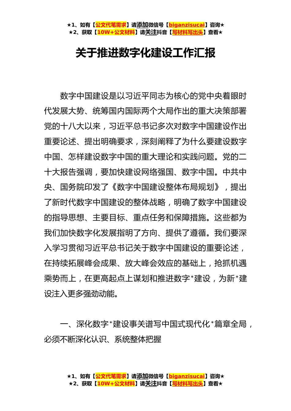 ★1、如有【公文代笔需求】请添加微信号【biganzisucai】咨询★★2、获取【10W+公文材料】请关注抖音【写材料写出头】查看★关于推进数字化建设工作汇报数字中国建设是以习近平同志为核心的党中央着眼时代发展大势、统筹国内国际两个大局作出的重大决策部署党的十八大以来,习近平总书记多次对数字中国建设作出重要论述、提出明确要求,深刻阐释了为什么要建设数字中国、怎样建设数字中国的重大理论和实践问题。党的二十大报告强调,要加快建设网络强国、数字中国。中共中央、国务院印发了《数字中国建设整体布局规划》,提出了新时代数字中国建设的整体战略,明确了数字中国建设的指导思想、主要目标、重点任务和保障措施。这些都为我们加快数字化发展指明了方向、提供了遵循。我们要深入学习贯彻习近平总书记关...
