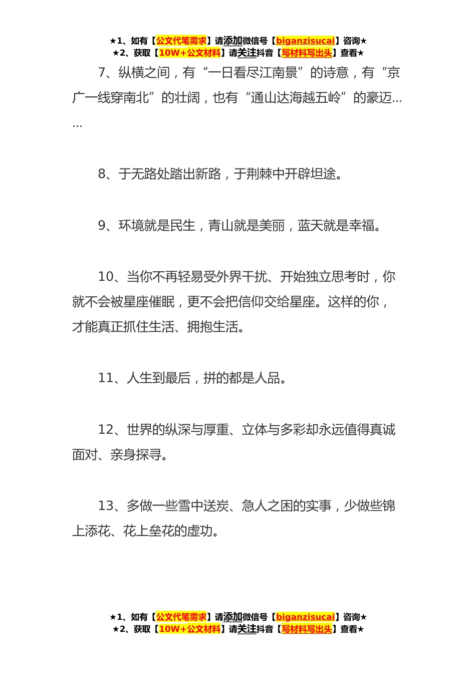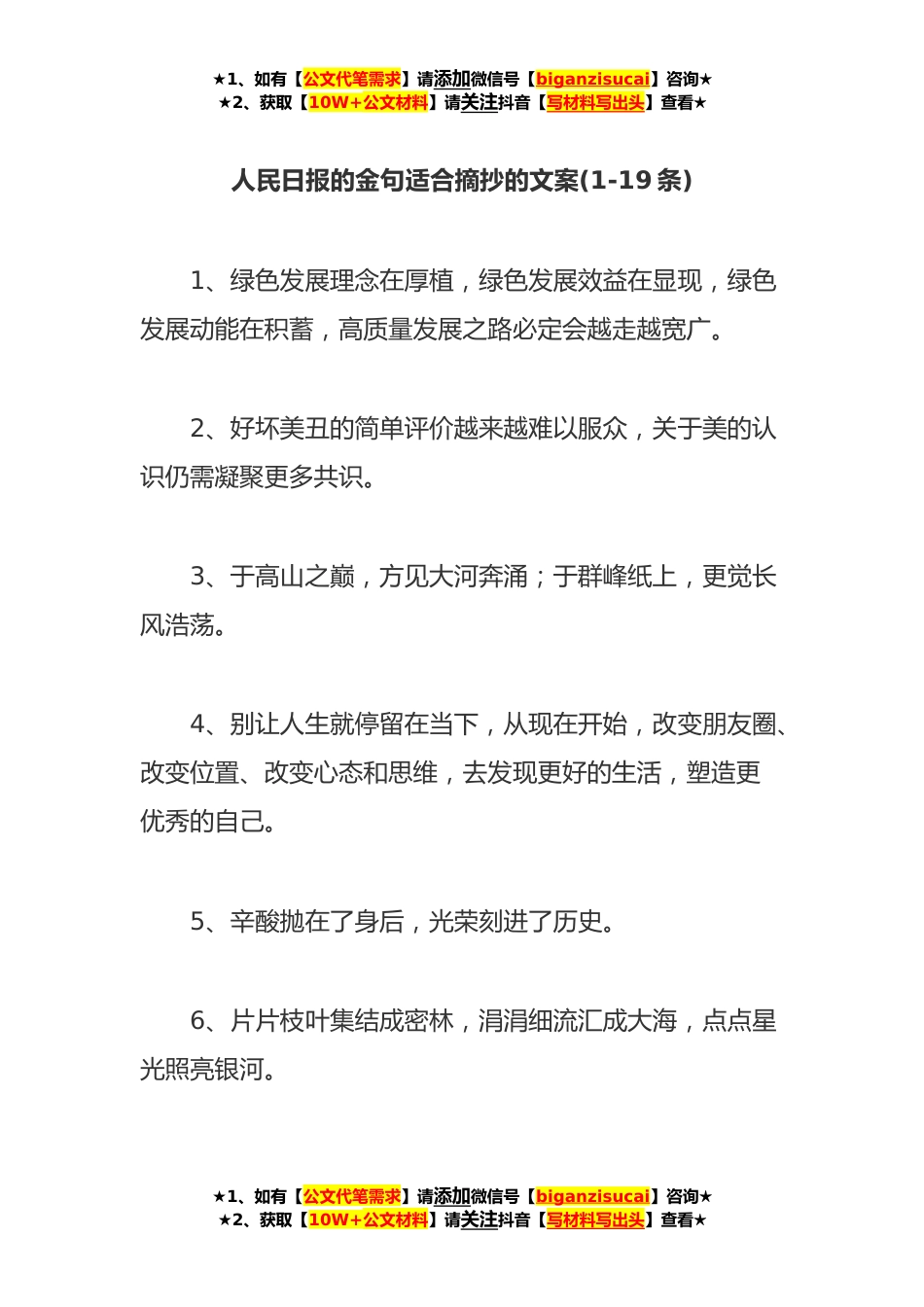 ★1、如有【公文代笔需求】请添加微信号【biganzisucai】咨询★★2、获取【10W+公文材料】请关注抖音【写材料写出头】查看★人民日报的金句适合摘抄的文案(1-19条)1、绿色发展理念在厚植,绿色发展效益在显现,绿色发展动能在积蓄,高质量发展之路必定会越走越宽广。2、好坏美丑的简单评价越来越难以服众,关于美的认识仍需凝聚更多共识。3、于高山之巅,方见大河奔涌;于群峰纸上,更觉长风浩荡。4、别让人生就停留在当下,从现在开始,改变朋友圈、改变位置、改变心态和思维,去发现更好的生活,塑造更优秀的自己。5、辛酸抛在了身后,光荣刻进了历史。6、片片枝叶集结成密林,涓涓细流汇成大海,点点星光照亮银河。★1、如有【公文代笔需求】请添加微信号【biganzisucai】咨询★★2、获取【10W+公文材料】请关...