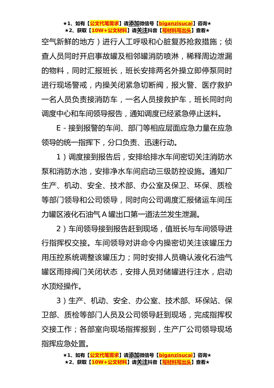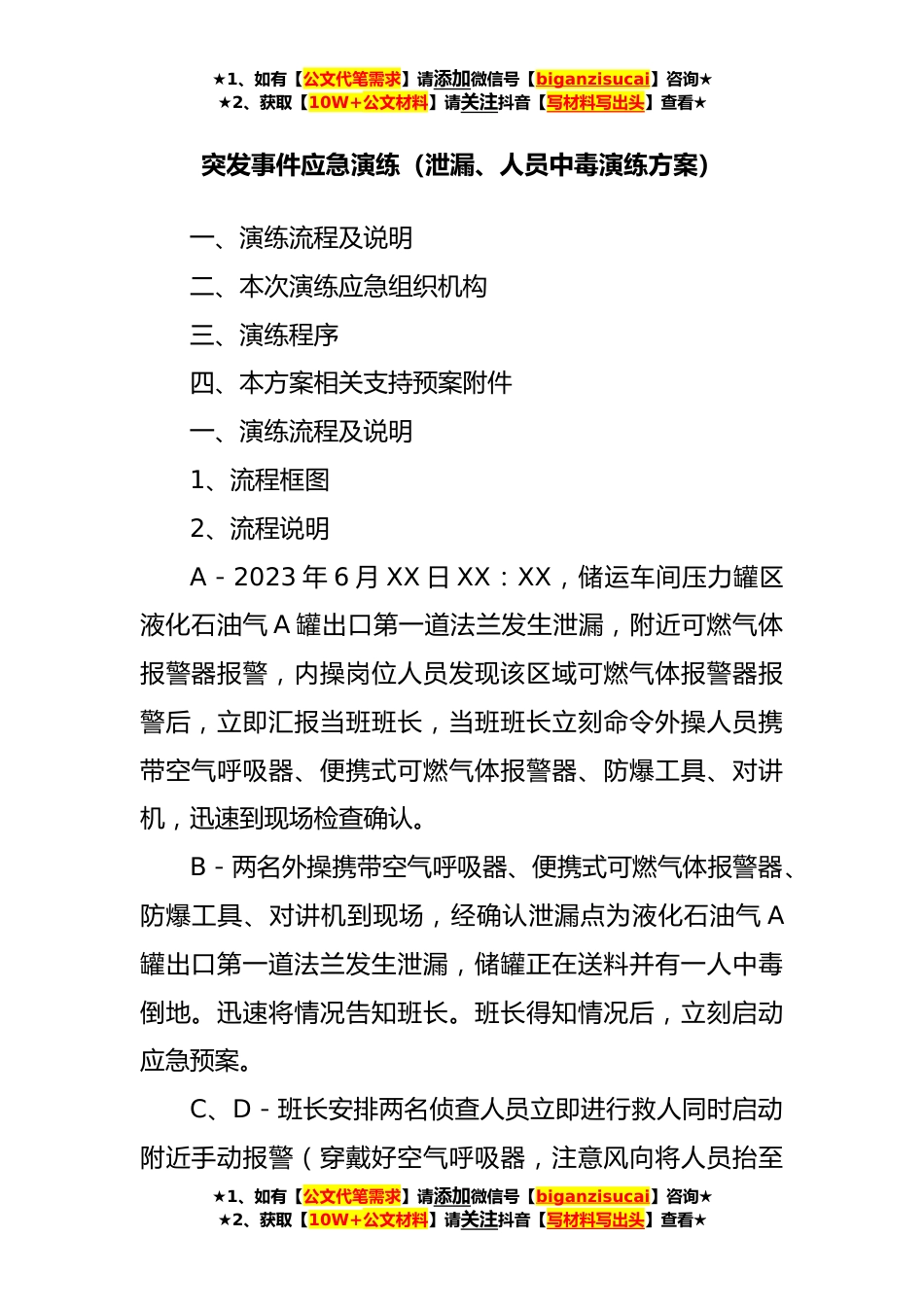 ★1、如有【公文代笔需求】请添加微信号【biganzisucai】咨询★★2、获取【10W+公文材料】请关注抖音【写材料写出头】查看★突发事件应急演练(泄漏、人员中毒演练方案)一、演练流程及说明二、本次演练应急组织机构三、演练程序四、本方案相关支持预案附件一、演练流程及说明1、流程框图2、流程说明A-2023年6月XX日XX:XX,储运车间压力罐区液化石油气A罐出口第一道法兰发生泄漏,附近可燃气体报警器报警,内操岗位人员发现该区域可燃气体报警器报警后,立即汇报当班班长,当班班长立刻命令外操人员携带空气呼吸器、便携式可燃气体报警器、防爆工具、对讲机,迅速到现场检查确认。B-两名外操携带空气呼吸器、便携式可燃气体报警器、防爆工具、对讲机到现场,经确认泄漏点为液化石油气A罐出口第一道法兰发生泄漏...