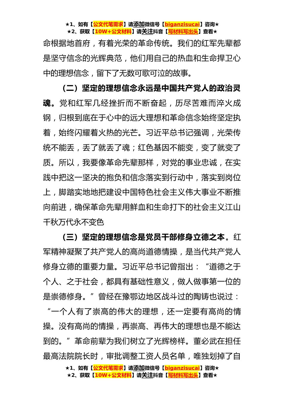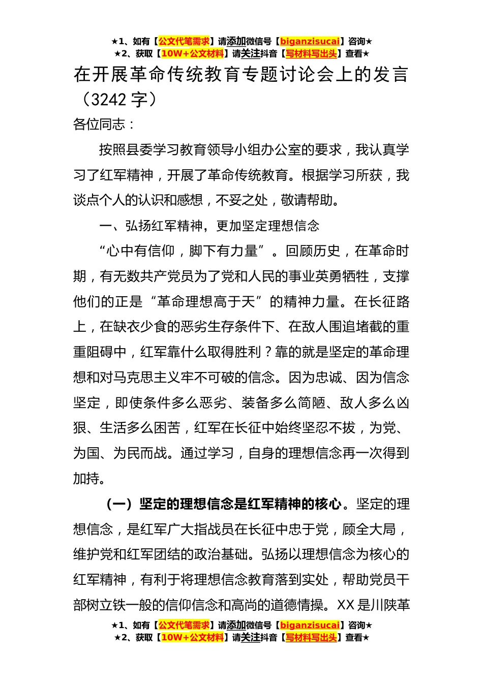 ★1、如有【公文代笔需求】请添加微信号【biganzisucai】咨询★★2、获取【10W+公文材料】请关注抖音【写材料写出头】查看★在开展革命传统教育专题讨论会上的发言(3242字)各位同志:按照县委学习教育领导小组办公室的要求,我认真学习了红军精神,开展了革命传统教育。根据学习所获,我谈点个人的认识和感想,不妥之处,敬请帮助。一、弘扬红军精神,更加坚定理想信念“心中有信仰,脚下有力量”。回顾历史,在革命时期,有无数共产党员为了党和人民的事业英勇牺牲,支撑他们的正是“革命理想高于天”的精神力量。在长征路上,在缺衣少食的恶劣生存条件下、在敌人围追堵截的重重阻碍中,红军靠什么取得胜利?靠的就是坚定的革命理想和对马克思主义牢不可破的信念。因为忠诚、因为信念坚定,即使条件多么恶劣、...