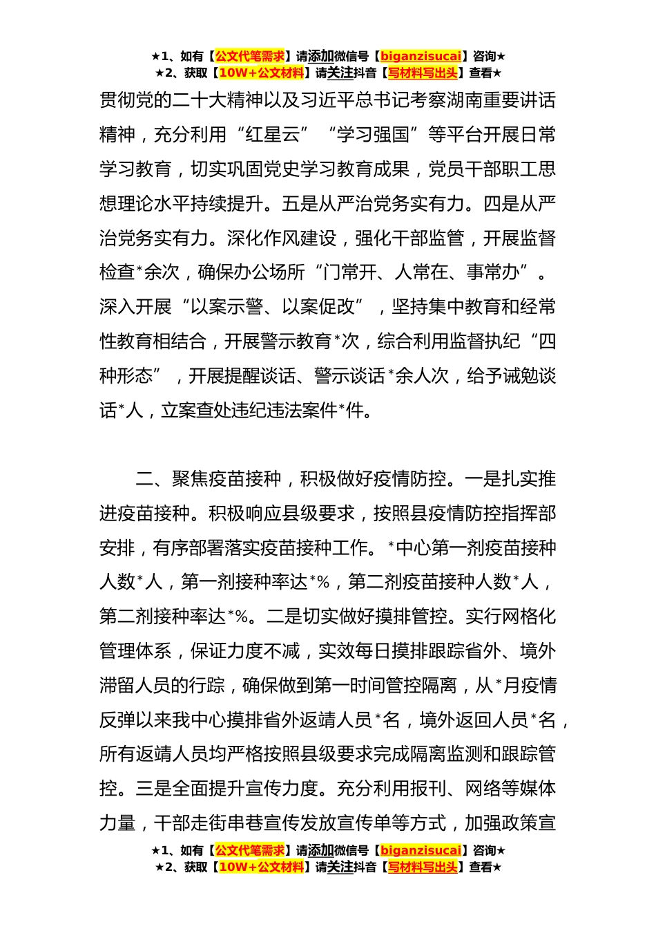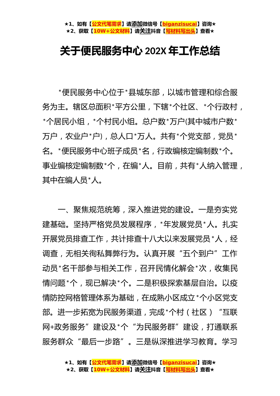 ★1、如有【公文代笔需求】请添加微信号【biganzisucai】咨询★★2、获取【10W+公文材料】请关注抖音【写材料写出头】查看★关于便民服务中心202X年工作总结*便民服务中心位于*县城东部,以城市管理和综合服务为主。辖区总面积*平方公里,下辖*个社区、*个行政村,*个居民小组,*个村民小组。总户数*万户(其中城市户数*万户,农业户*户),总人口*万人。共有*个党支部,党员*名。*便民服务中心班子成员*名,行政编核定编制数*个。事业编核定编制数*个,在编*人。目前,共有*人纳入管理,其中在编人员*人。一、聚焦规范统筹,深入推进党的建设。一是夯实党建基础。坚持严格党员发展程序,*年发展党员*人。扎实开展党员排查工作,共计排查十八大以来发展党员*人,经调查,无相关徇私舞弊行为。认真开展“五个到户”工...