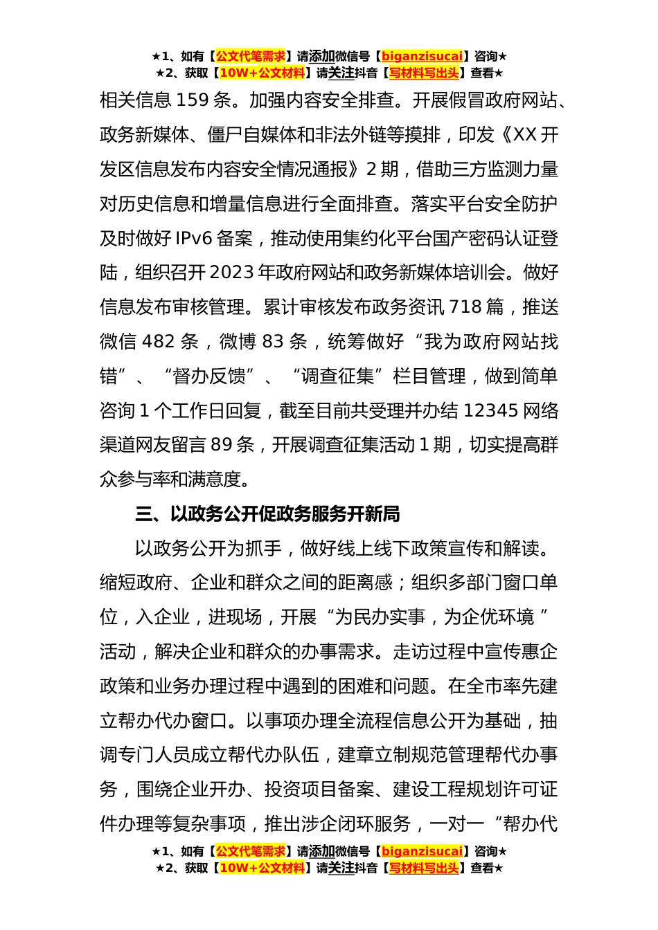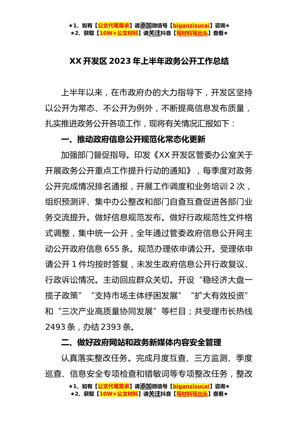 ★1、如有【公文代笔需求】请添加微信号【biganzisucai】咨询★★2、获取【10W+公文材料】请关注抖音【写材料写出头】查看★XX开发区2023年上半年政务公开工作总结上半年以来,在市政府办的大力指导下,开发区坚持以公开为常态、不公开为例外,不断提高信息发布质量,扎实推进政务公开各项工作,现将有关情况汇报如下:一、推动政府信息公开规范化常态化更新加强部门督促指导。印发《XX开发区管委办公室关于开展政务公开重点工作提升行动的通知》,每季度对政务公开完成情况排名通报,开展工作调度和业务培训2次,组织预测评、集中办公整改和部门自查互查促进各部门业务交流提升。做好信息规范发布。做好行政规范性文件格式调整,集中统一公开,全年通过管委政府信息公开网主动公开政府信息655条。规范办理依申请...