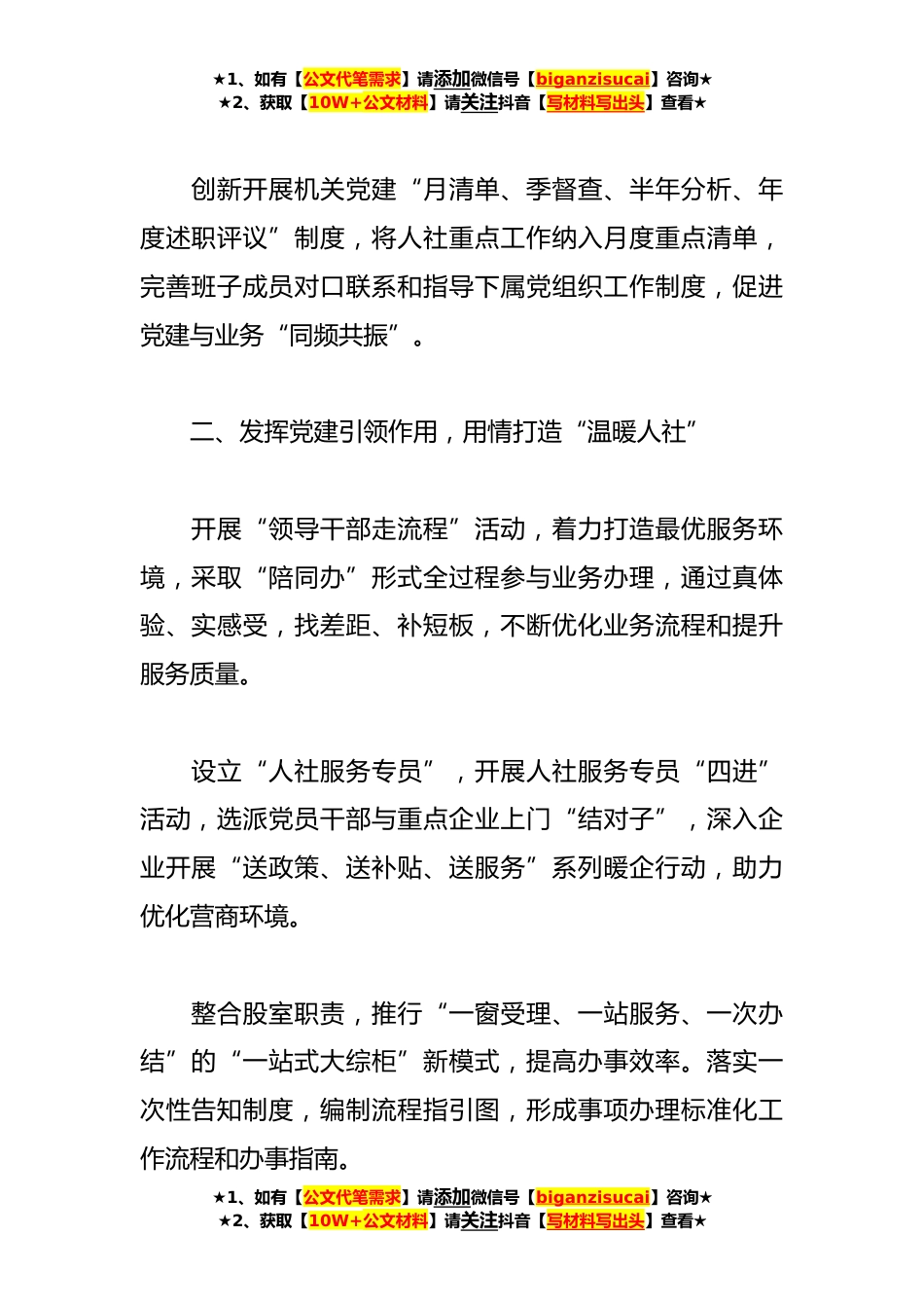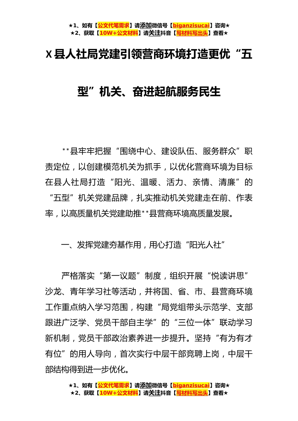 ★1、如有【公文代笔需求】请添加微信号【biganzisucai】咨询★★2、获取【10W+公文材料】请关注抖音【写材料写出头】查看★X县人社局党建引领营商环境打造更优“五型”机关、奋进起航服务民生**县牢牢把握“围绕中心、建设队伍、服务群众”职责定位,以创建模范机关为抓手,以优化营商环境为目标在县人社局打造“阳光、温暖、活力、亲情、清廉”的“五型”机关党建品牌,扎实推动机关党建走在前、作表率,以高质量机关党建助推**县营商环境高质量发展。一、发挥党建夯基作用,用心打造“阳光人社”严格落实“第一议题”制度,组织开展“悦读讲思”沙龙、青年学习社等活动,并将国、省、市、县营商环境工作重点纳入学习范围,构建“局党组带头示范学、支部跟进广泛学、党员干部自主学”的“三位一体”联动学习新机...