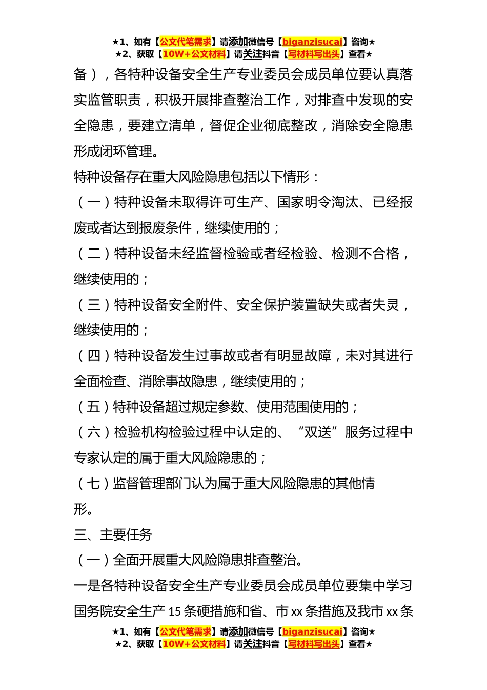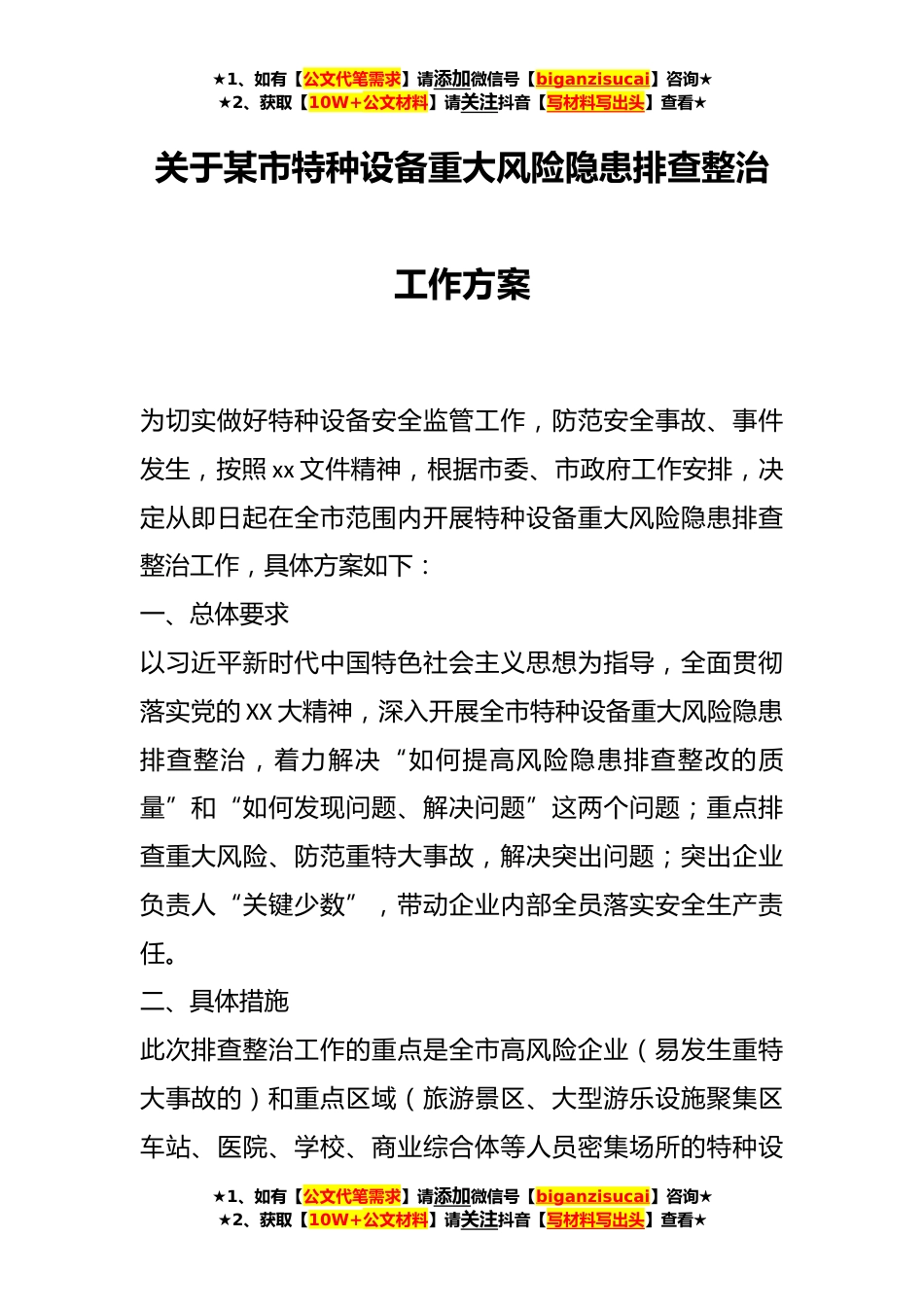 ★1、如有【公文代笔需求】请添加微信号【biganzisucai】咨询★★2、获取【10W+公文材料】请关注抖音【写材料写出头】查看★关于某市特种设备重大风险隐患排查整治工作方案为切实做好特种设备安全监管工作,防范安全事故、事件发生,按照xx文件精神,根据市委、市政府工作安排,决定从即日起在全市范围内开展特种设备重大风险隐患排查整治工作,具体方案如下:一、总体要求以习近平新时代中国特色社会主义思想为指导,全面贯彻落实党的XX大精神,深入开展全市特种设备重大风险隐患排查整治,着力解决“如何提高风险隐患排查整改的质量”和“如何发现问题、解决问题”这两个问题;重点排查重大风险、防范重特大事故,解决突出问题;突出企业负责人“关键少数”,带动企业内部全员落实安全生产责任。二、具体措施此...