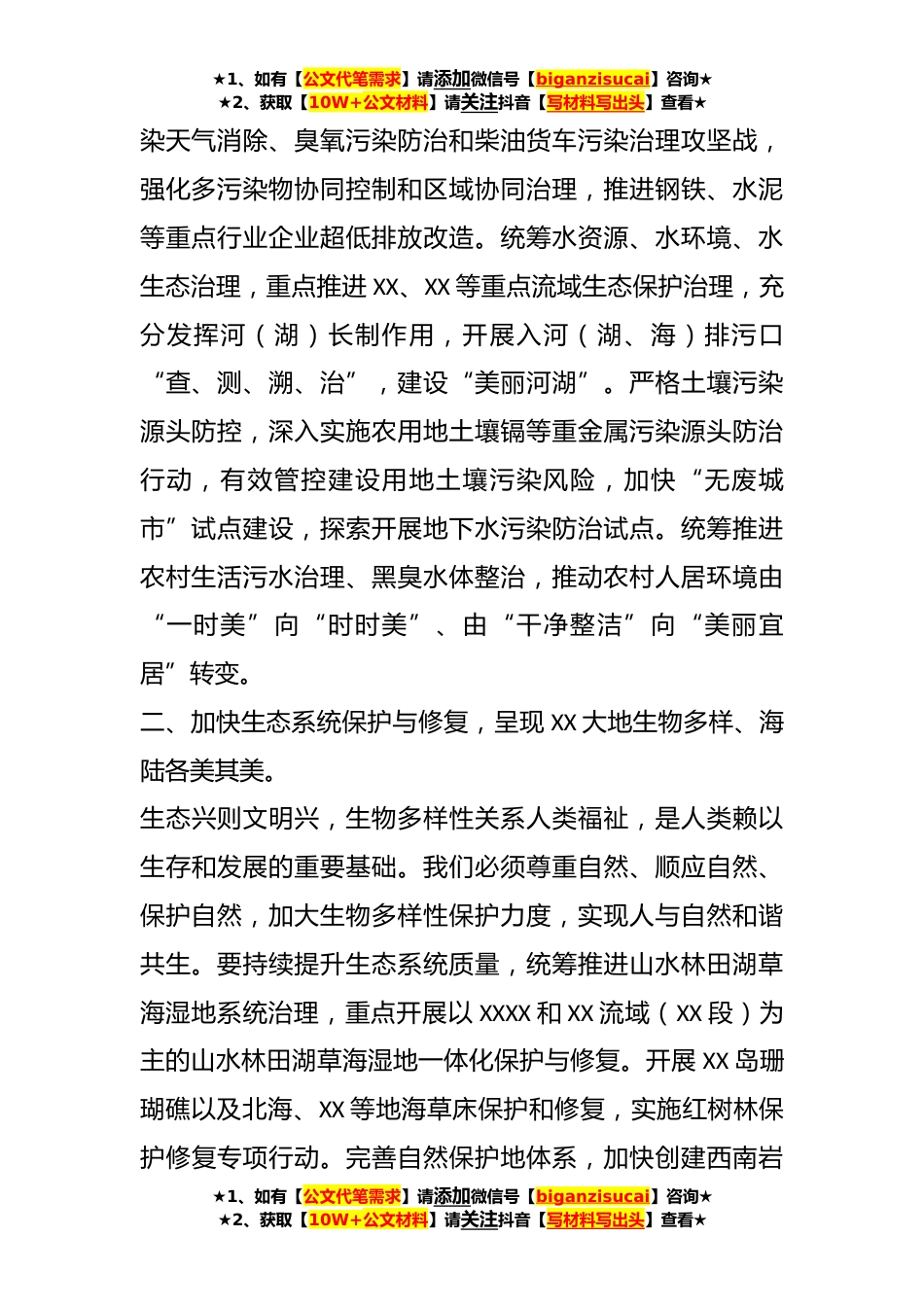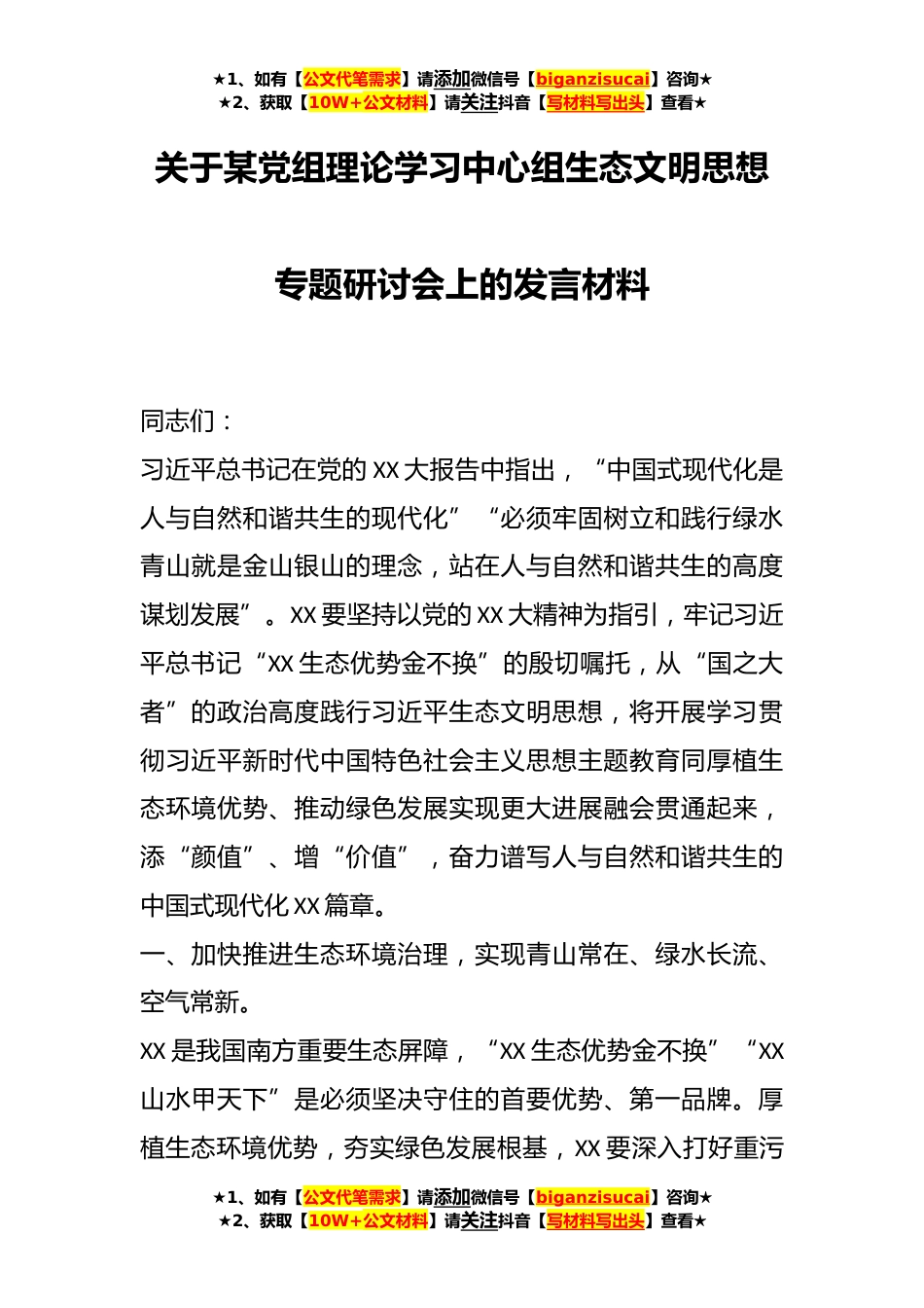 ★1、如有【公文代笔需求】请添加微信号【biganzisucai】咨询★★2、获取【10W+公文材料】请关注抖音【写材料写出头】查看★关于某党组理论学习中心组生态文明思想专题研讨会上的发言材料同志们:习近平总书记在党的XX大报告中指出,“中国式现代化是人与自然和谐共生的现代化”“必须牢固树立和践行绿水青山就是金山银山的理念,站在人与自然和谐共生的高度谋划发展”。XX要坚持以党的XX大精神为指引,牢记习近平总书记“XX生态优势金不换”的殷切嘱托,从“国之大者”的政治高度践行习近平生态文明思想,将开展学习贯彻习近平新时代中国特色社会主义思想主题教育同厚植生态环境优势、推动绿色发展实现更大进展融会贯通起来,添“颜值”、增“价值”,奋力谱写人与自然和谐共生的中国式现代化XX篇章。一、加快推...
