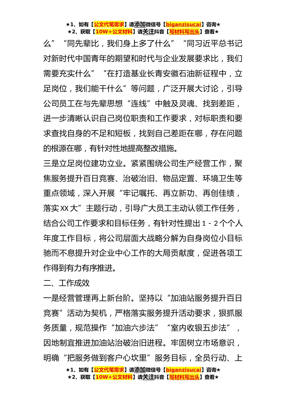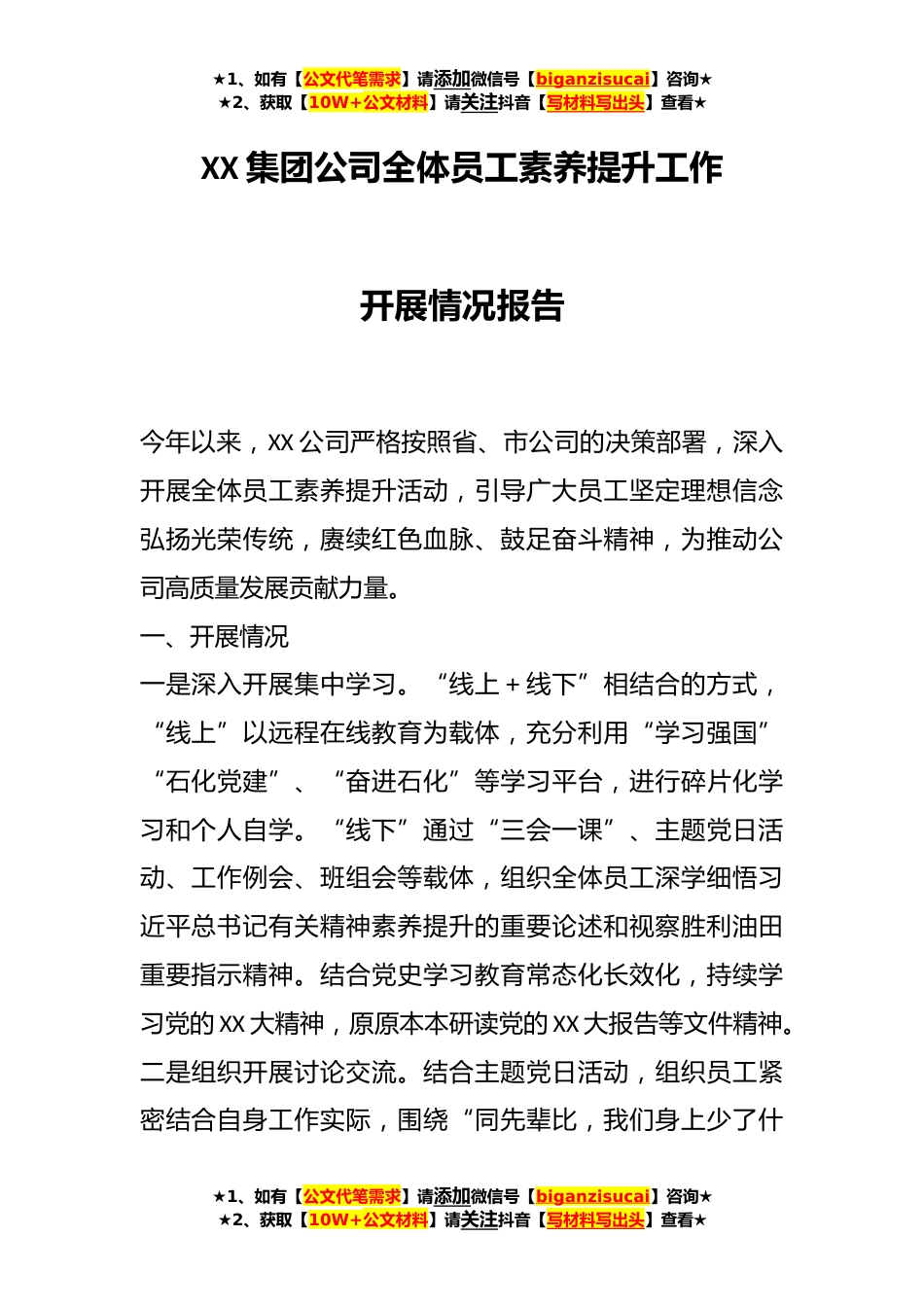 ★1、如有【公文代笔需求】请添加微信号【biganzisucai】咨询★★2、获取【10W+公文材料】请关注抖音【写材料写出头】查看★XX集团公司全体员工素养提升工作开展情况报告今年以来,XX公司严格按照省、市公司的决策部署,深入开展全体员工素养提升活动,引导广大员工坚定理想信念弘扬光荣传统,赓续红色血脉、鼓足奋斗精神,为推动公司高质量发展贡献力量。一、开展情况一是深入开展集中学习。“线上+线下”相结合的方式,“线上”以远程在线教育为载体,充分利用“学习强国”“石化党建”、“奋进石化”等学习平台,进行碎片化学习和个人自学。“线下”通过“三会一课”、主题党日活动、工作例会、班组会等载体,组织全体员工深学细悟习近平总书记有关精神素养提升的重要论述和视察胜利油田重要指示精神。结合党...