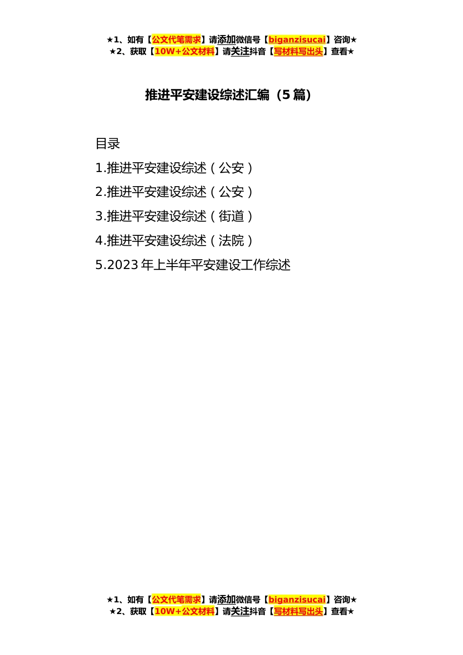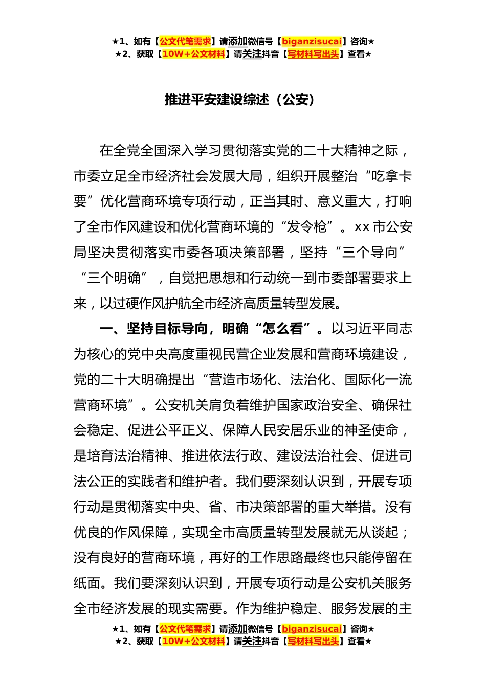 ★1、如有【公文代笔需求】请添加微信号【biganzisucai】咨询★★2、获取【10W+公文材料】请关注抖音【写材料写出头】查看★推进平安建设综述汇编(5篇)目录1.推进平安建设综述(公安)2.推进平安建设综述(公安)3.推进平安建设综述(街道)4.推进平安建设综述(法院)5.2023年上半年平安建设工作综述★1、如有【公文代笔需求】请添加微信号【biganzisucai】咨询★★2、获取【10W+公文材料】请关注抖音【写材料写出头】查看★★1、如有【公文代笔需求】请添加微信号【biganzisucai】咨询★★2、获取【10W+公文材料】请关注抖音【写材料写出头】查看★推进平安建设综述(公安)在全党全国深入学习贯彻落实党的二十大精神之际,市委立足全市经济社会发展大局,组织开展整治“吃拿卡要”优化营商环境专项行动,正当...