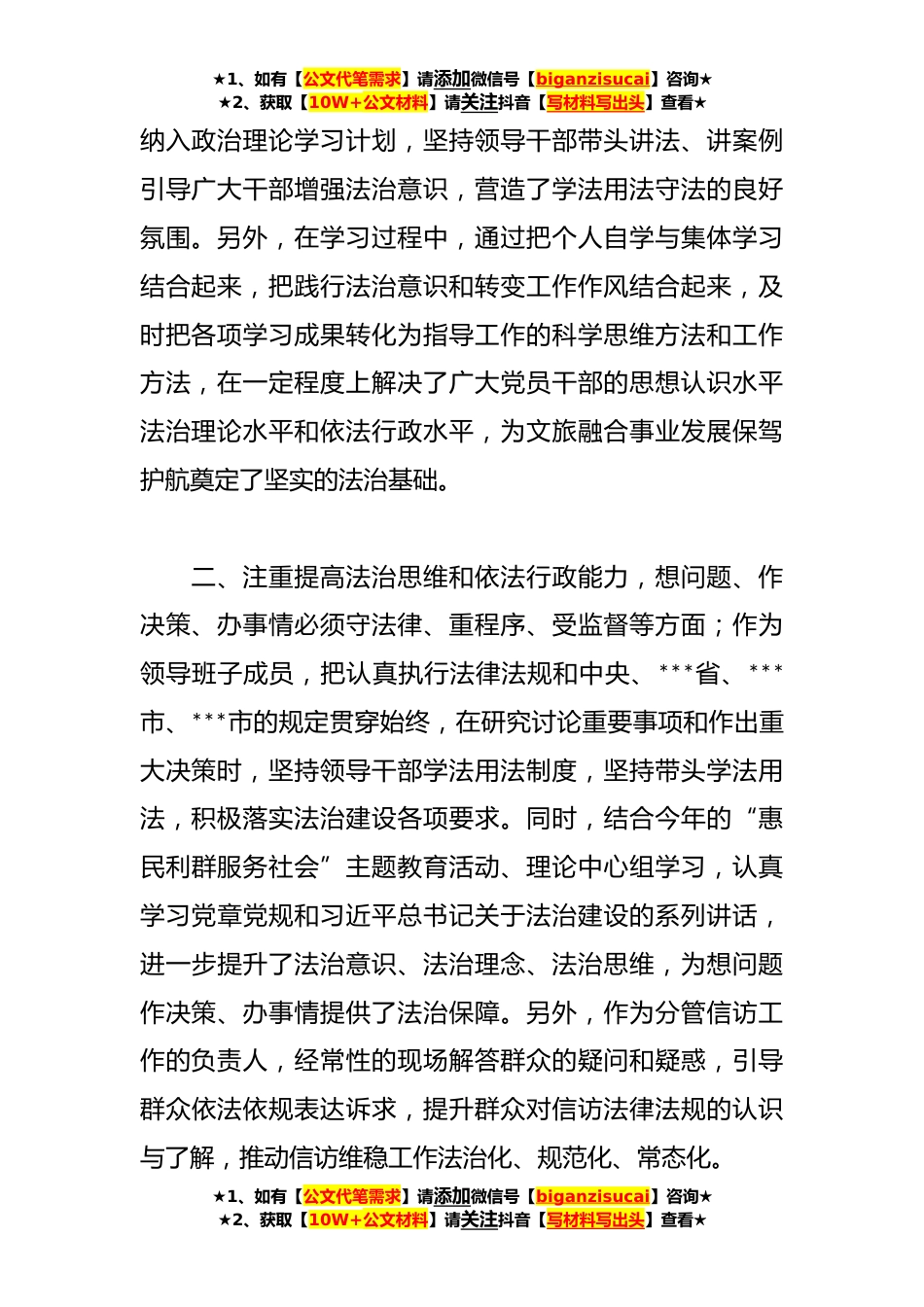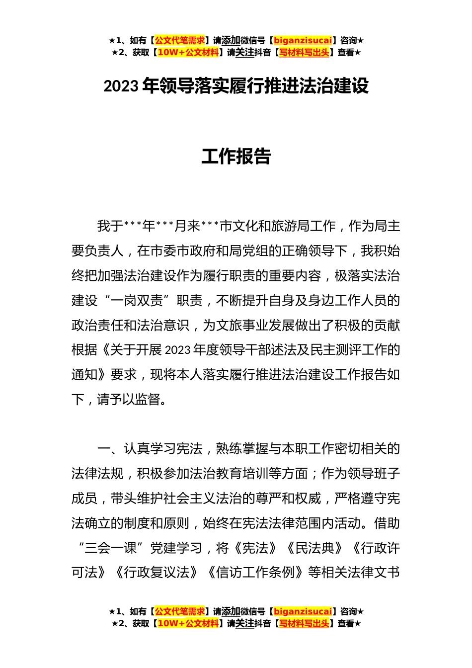 ★1、如有【公文代笔需求】请添加微信号【biganzisucai】咨询★★2、获取【10W+公文材料】请关注抖音【写材料写出头】查看★2023年领导落实履行推进法治建设工作报告我于***年***月来***市文化和旅游局工作,作为局主要负责人,在市委市政府和局党组的正确领导下,我积始终把加强法治建设作为履行职责的重要内容,极落实法治建设“一岗双责”职责,不断提升自身及身边工作人员的政治责任和法治意识,为文旅事业发展做出了积极的贡献根据《关于开展2023年度领导干部述法及民主测评工作的通知》要求,现将本人落实履行推进法治建设工作报告如下,请予以监督。一、认真学习宪法,熟练掌握与本职工作密切相关的法律法规,积极参加法治教育培训等方面;作为领导班子成员,带头维护社会主义法治的尊严和权威,严格遵守宪...