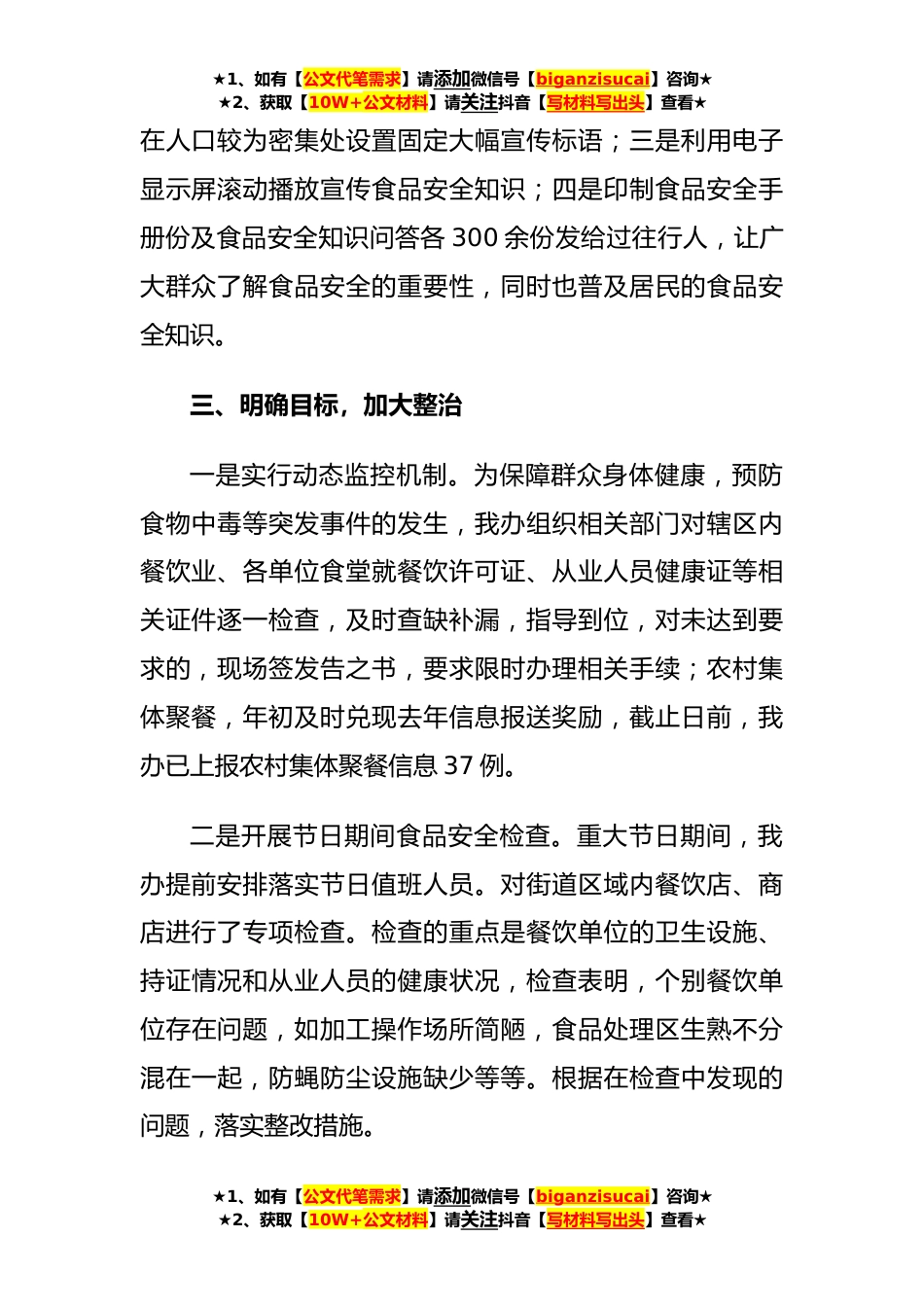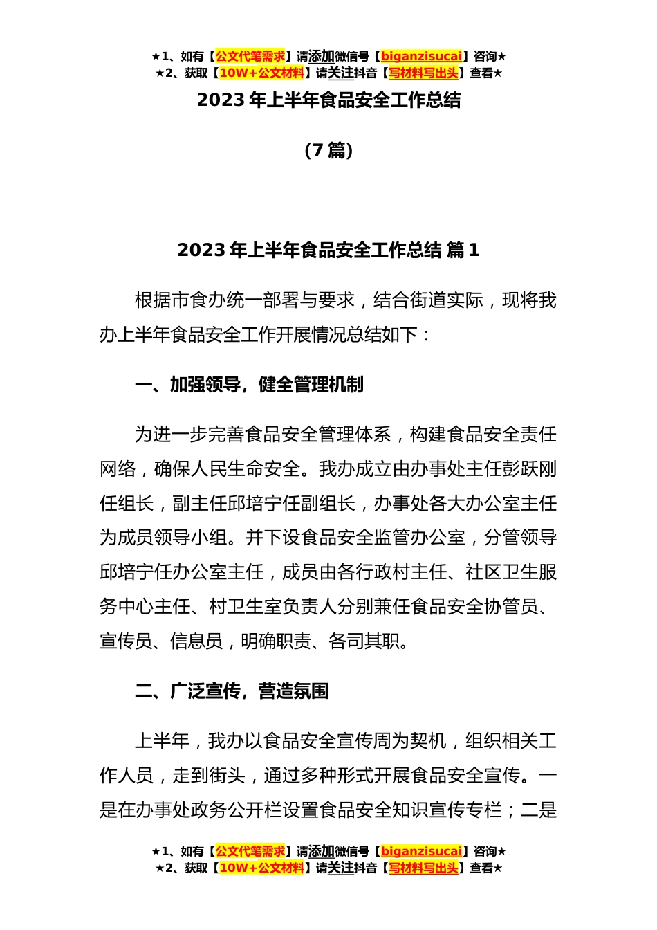 ★1、如有【公文代笔需求】请添加微信号【biganzisucai】咨询★★2、获取【10W+公文材料】请关注抖音【写材料写出头】查看★2023年上半年食品安全工作总结(7篇)2023年上半年食品安全工作总结篇1根据市食办统一部署与要求,结合街道实际,现将我办上半年食品安全工作开展情况总结如下:一、加强领导,健全管理机制为进一步完善食品安全管理体系,构建食品安全责任网络,确保人民生命安全。我办成立由办事处主任彭跃刚任组长,副主任邱培宁任副组长,办事处各大办公室主任为成员领导小组。并下设食品安全监管办公室,分管领导邱培宁任办公室主任,成员由各行政村主任、社区卫生服务中心主任、村卫生室负责人分别兼任食品安全协管员、宣传员、信息员,明确职责、各司其职。二、广泛宣传,营造氛围上半年,我办以食...