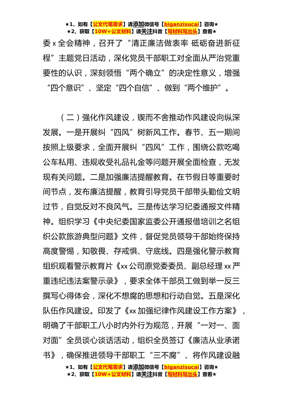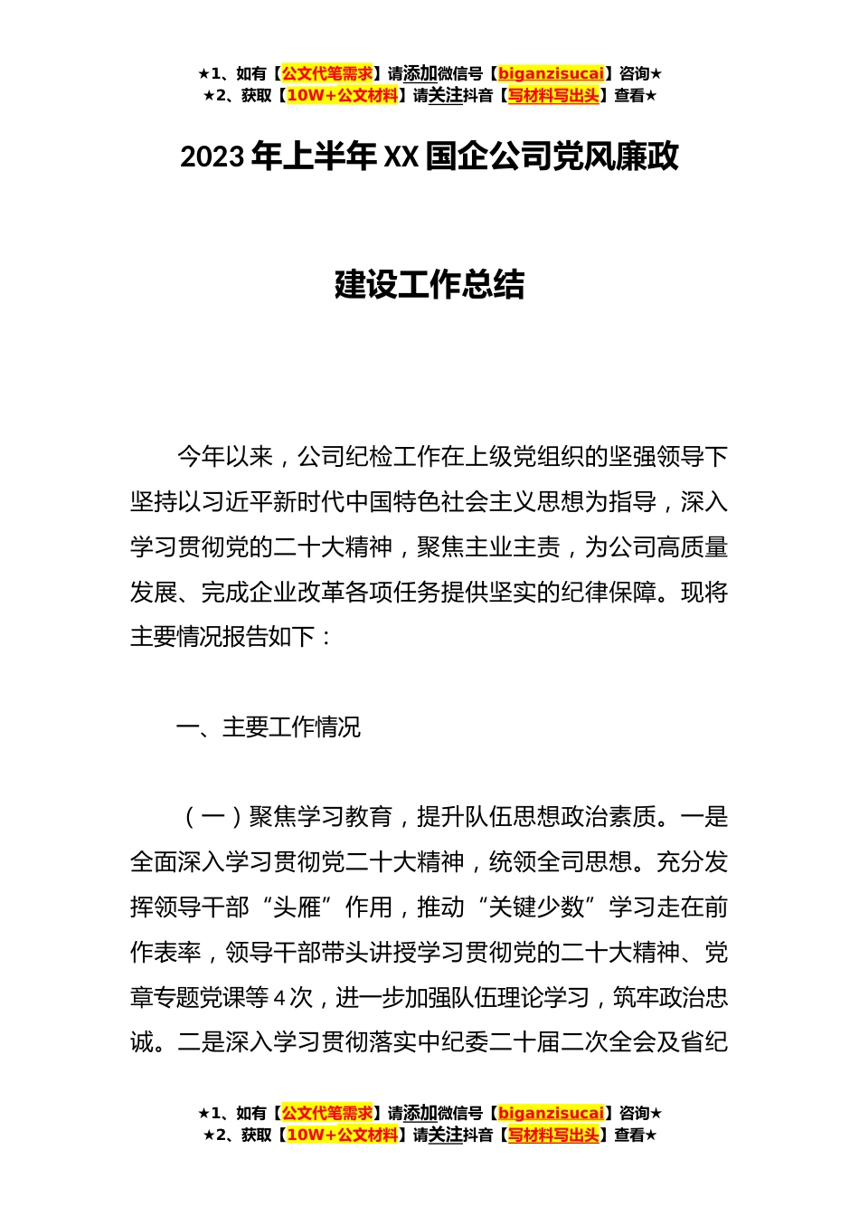 ★1、如有【公文代笔需求】请添加微信号【biganzisucai】咨询★★2、获取【10W+公文材料】请关注抖音【写材料写出头】查看★2023年上半年XX国企公司党风廉政建设工作总结今年以来,公司纪检工作在上级党组织的坚强领导下坚持以习近平新时代中国特色社会主义思想为指导,深入学习贯彻党的二十大精神,聚焦主业主责,为公司高质量发展、完成企业改革各项任务提供坚实的纪律保障。现将主要情况报告如下:一、主要工作情况(一)聚焦学习教育,提升队伍思想政治素质。一是全面深入学习贯彻党二十大精神,统领全司思想。充分发挥领导干部“头雁”作用,推动“关键少数”学习走在前作表率,领导干部带头讲授学习贯彻党的二十大精神、党章专题党课等4次,进一步加强队伍理论学习,筑牢政治忠诚。二是深入学习贯彻落实中纪...