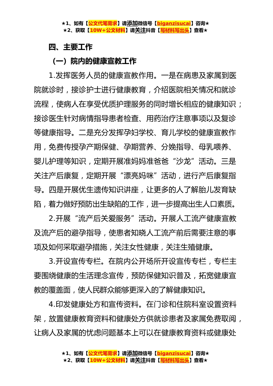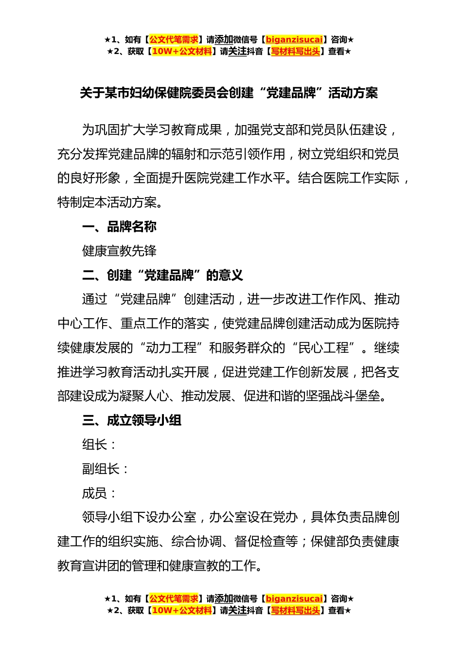 ★1、如有【公文代笔需求】请添加微信号【biganzisucai】咨询★★2、获取【10W+公文材料】请关注抖音【写材料写出头】查看★关于某市妇幼保健院委员会创建“党建品牌”活动方案为巩固扩大学习教育成果,加强党支部和党员队伍建设,充分发挥党建品牌的辐射和示范引领作用,树立党组织和党员的良好形象,全面提升医院党建工作水平。结合医院工作实际,特制定本活动方案。一、品牌名称健康宣教先锋二、创建“党建品牌”的意义通过“党建品牌”创建活动,进一步改进工作作风、推动中心工作、重点工作的落实,使党建品牌创建活动成为医院持续健康发展的“动力工程”和服务群众的“民心工程”。继续推进学习教育活动扎实开展,促进党建工作创新发展,把各支部建设成为凝聚人心、推动发展、促进和谐的坚强战斗堡垒。三、...