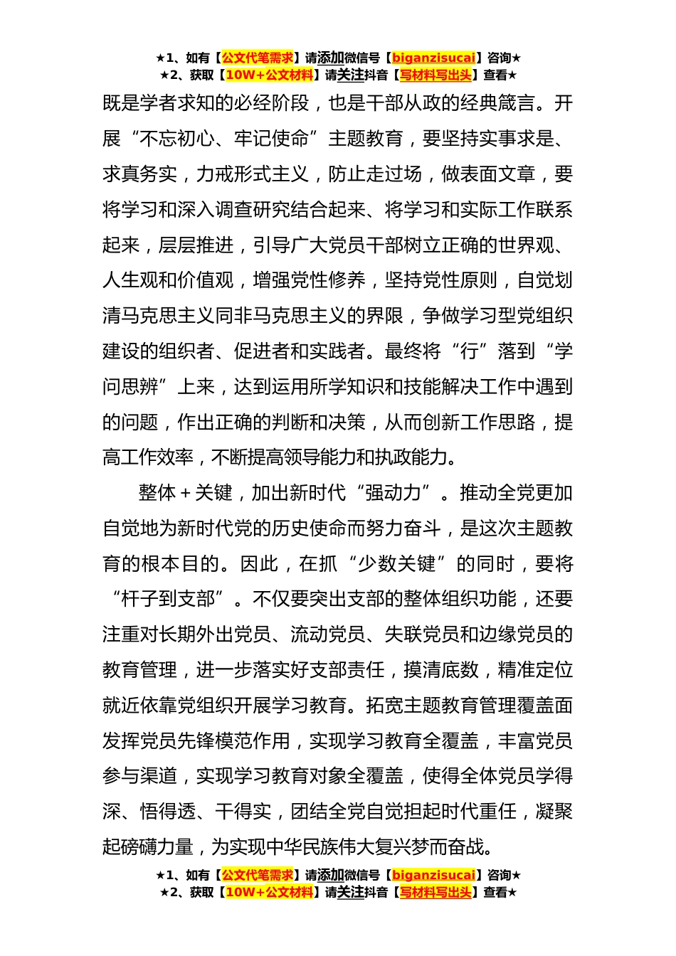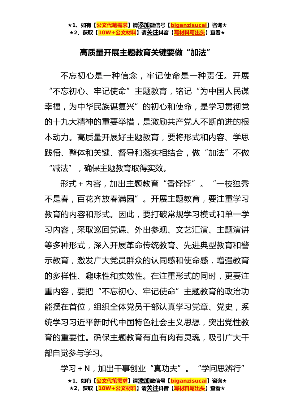 ★1、如有【公文代笔需求】请添加微信号【biganzisucai】咨询★★2、获取【10W+公文材料】请关注抖音【写材料写出头】查看★高质量开展主题教育关键要做“加法”不忘初心是一种信念,牢记使命是一种责任。开展“不忘初心、牢记使命”主题教育,铭记“为中国人民谋幸福,为中华民族谋复兴”的初心和使命,是学习贯彻党的十九大精神的重要举措,是激励共产党人不断前进的根本动力。高质量开展好主题教育,要将形式和内容、学思践悟、整体和关键、督导和落实相结合,做“加法”不做“减法”,确保主题教育取得实效。形式+内容,加出主题教育“香饽饽”。“一枝独秀不是春,百花齐放春满园”。开展主题教育,要注重学习教育的内容和形式。因此,要打破常规学习模式和单一学习内容,采取巡回党课、外出参观、文艺汇演...