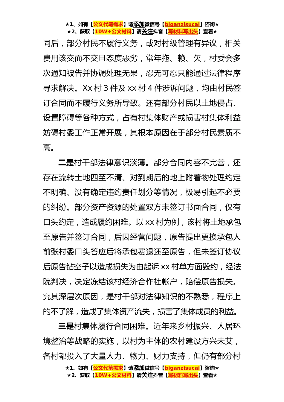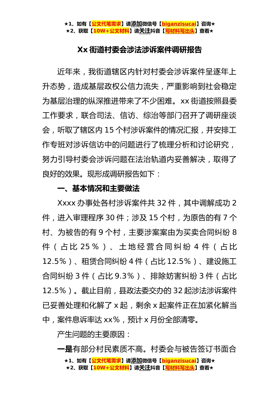 ★1、如有【公文代笔需求】请添加微信号【biganzisucai】咨询★★2、获取【10W+公文材料】请关注抖音【写材料写出头】查看★Xx街道村委会涉法涉诉案件调研报告近年来,我街道辖区内针对村委会涉诉案件呈逐年上升态势,造成基层政权公信力流失,严重影响到社会稳定为基层治理的纵深推进带来了不少困难。xx街道按照县委工作要求,联合司法、信访、综治等部门召开了调研座谈会,听取了辖区内15个村涉诉案件的情况汇报,并安排工作专班对涉诉信访中的问题进行了梳理分析和讨论研究,努力引导村委会涉诉问题在法治轨道内妥善解决,取得了良好的效果。现形成调研报告如下:一、基本情况和主要做法Xxxx办事处各村涉诉案件共32件,其中调解成功2件,进入审理程序30件;涉及15个村,为原告的有7个村、为被告的有9个村,主要...