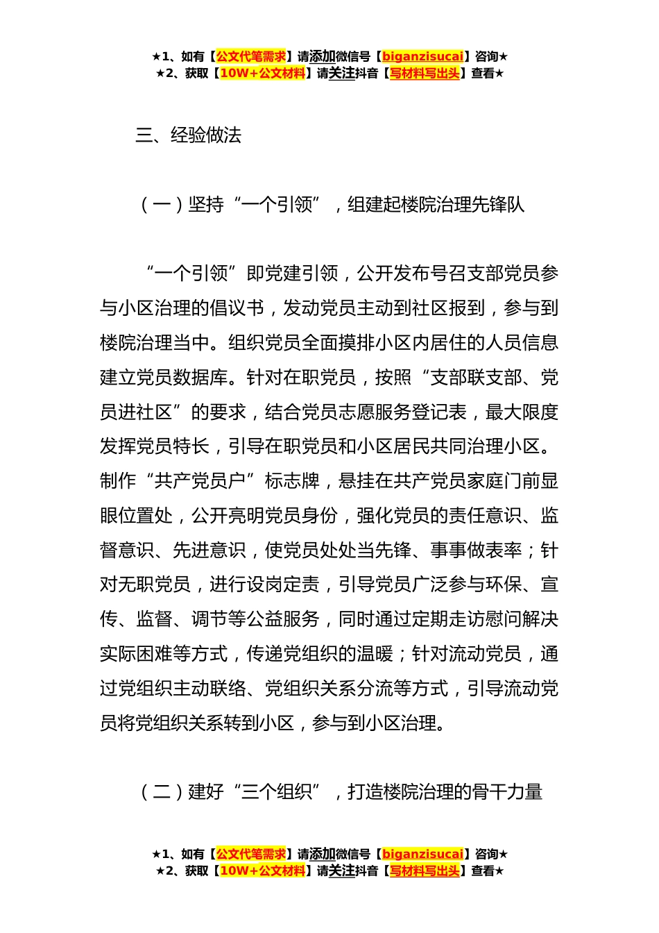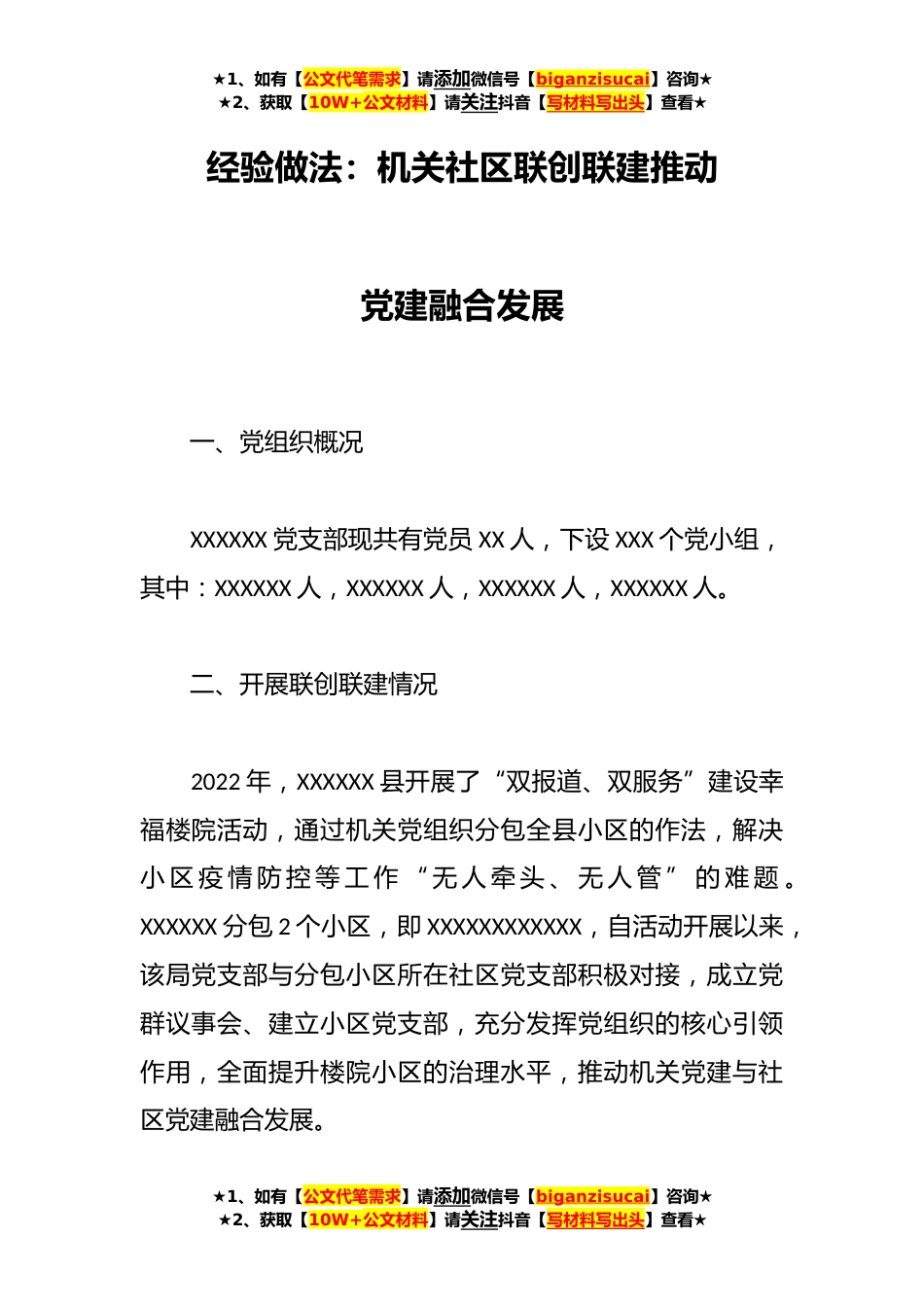 ★1、如有【公文代笔需求】请添加微信号【biganzisucai】咨询★★2、获取【10W+公文材料】请关注抖音【写材料写出头】查看★经验做法:机关社区联创联建推动党建融合发展一、党组织概况XXXXXX党支部现共有党员XX人,下设XXX个党小组,其中:XXXXXX人,XXXXXX人,XXXXXX人,XXXXXX人。二、开展联创联建情况2022年,XXXXXX县开展了“双报道、双服务”建设幸福楼院活动,通过机关党组织分包全县小区的作法,解决小区疫情防控等工作“无人牵头、无人管”的难题。XXXXXX分包2个小区,即XXXXXXXXXXXX,自活动开展以来,该局党支部与分包小区所在社区党支部积极对接,成立党群议事会、建立小区党支部,充分发挥党组织的核心引领作用,全面提升楼院小区的治理水平,推动机关党建与社区党建融合发展。★1、如有【公文代笔需...