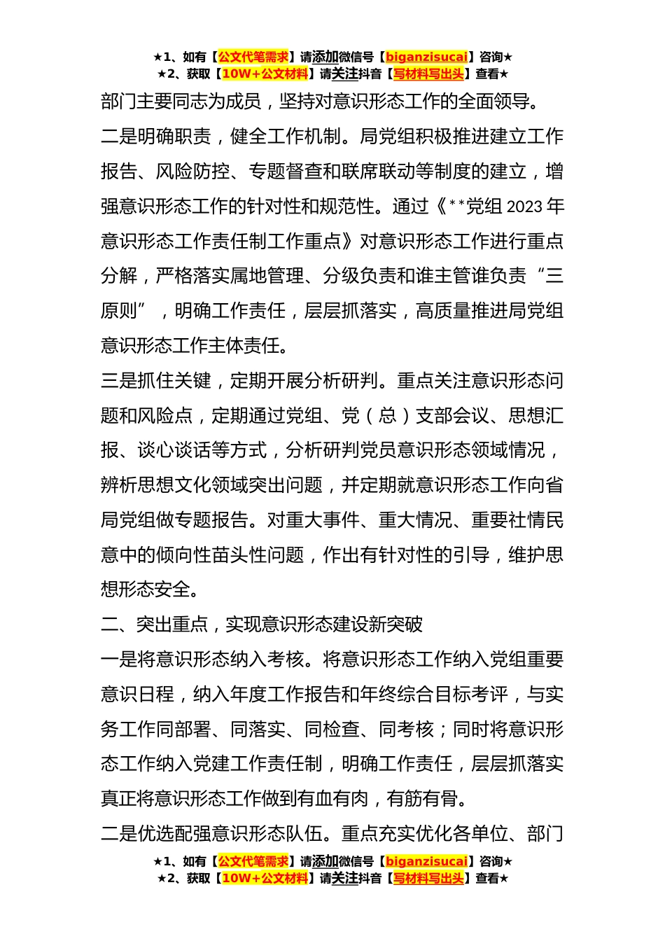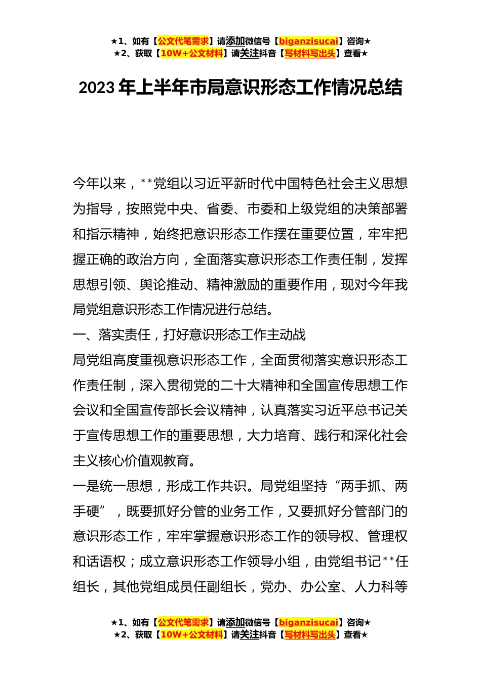 ★1、如有【公文代笔需求】请添加微信号【biganzisucai】咨询★★2、获取【10W+公文材料】请关注抖音【写材料写出头】查看★2023年上半年市局意识形态工作情况总结今年以来,**党组以习近平新时代中国特色社会主义思想为指导,按照党中央、省委、市委和上级党组的决策部署和指示精神,始终把意识形态工作摆在重要位置,牢牢把握正确的政治方向,全面落实意识形态工作责任制,发挥思想引领、舆论推动、精神激励的重要作用,现对今年我局党组意识形态工作情况进行总结。一、落实责任,打好意识形态工作主动战局党组高度重视意识形态工作,全面贯彻落实意识形态工作责任制,深入贯彻党的二十大精神和全国宣传思想工作会议和全国宣传部长会议精神,认真落实习近平总书记关于宣传思想工作的重要思想,大力培育、践行和...
