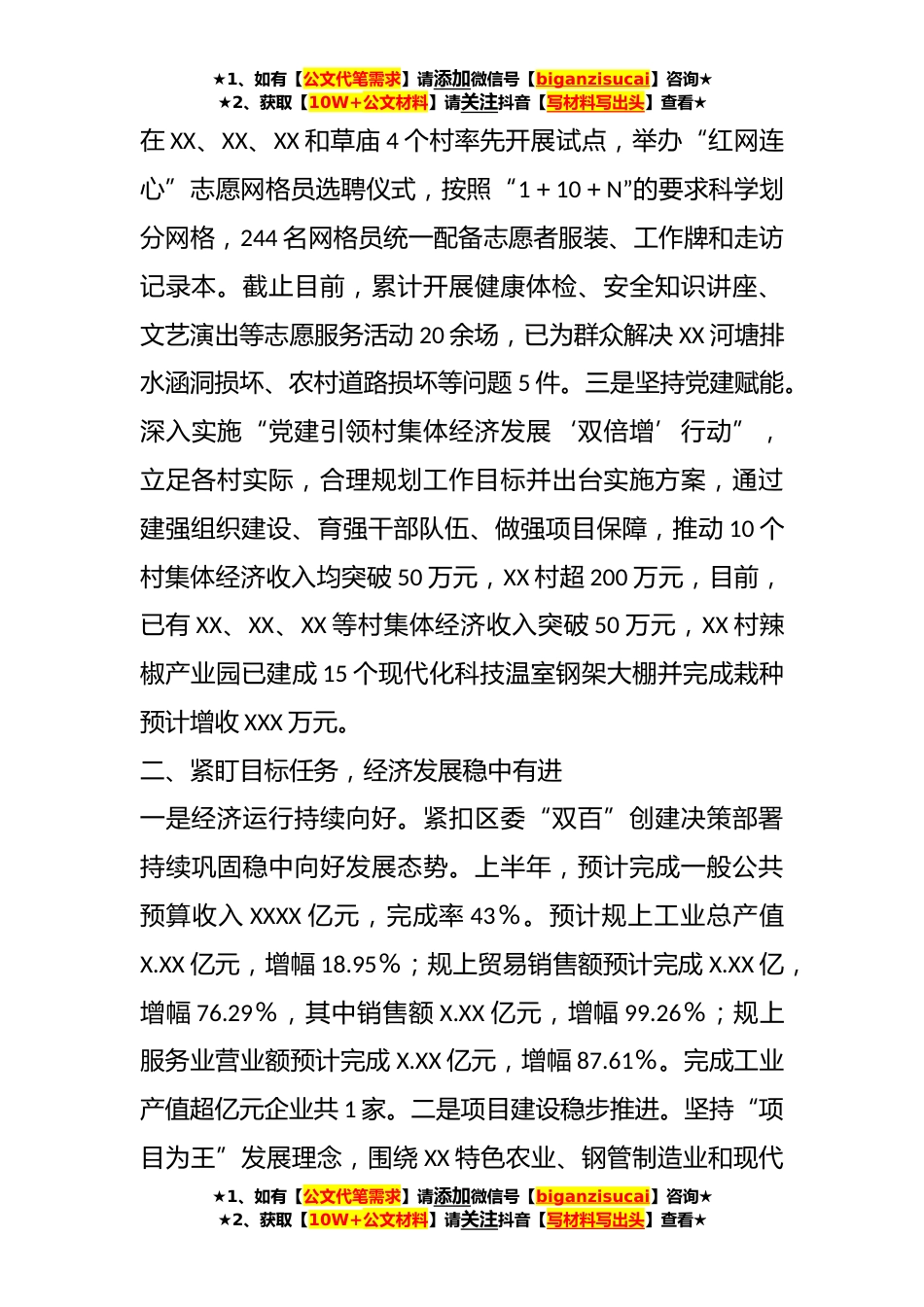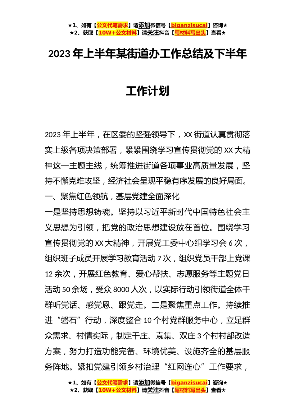 ★1、如有【公文代笔需求】请添加微信号【biganzisucai】咨询★★2、获取【10W+公文材料】请关注抖音【写材料写出头】查看★2023年上半年某街道办工作总结及下半年工作计划2023年上半年,在区委的坚强领导下,XX街道认真贯彻落实上级各项决策部署,紧紧围绕学习宣传贯彻党的XX大精神这一主题主线,统筹推进街道各项事业高质量发展,坚持不懈克难攻坚,经济社会呈现平稳有序发展的良好局面。一、聚焦红色领航,基层党建全面深化一是坚持思想铸魂。坚持以习近平新时代中国特色社会主义思想为引领,把党的政治思想建设放在首位。围绕学习宣传贯彻党的XX大精神,开展党工委中心组学习会6次,组织班子成员开展学习教育活动7次,组织党员干部上党课12余次,开展红色教育、爱心帮扶、志愿服务等主题党日活动50余场,受众8...