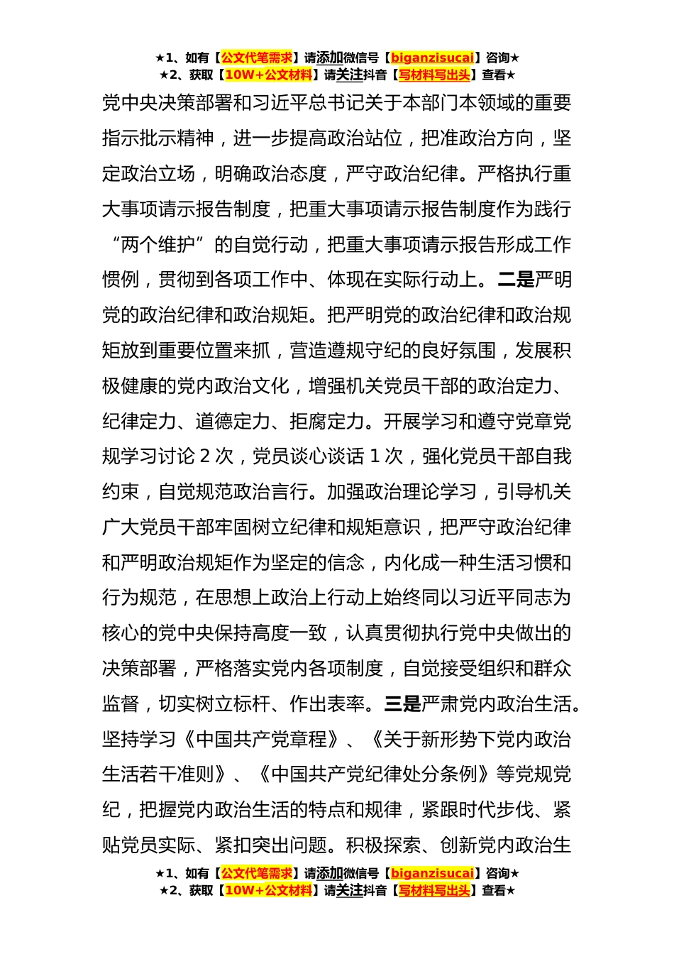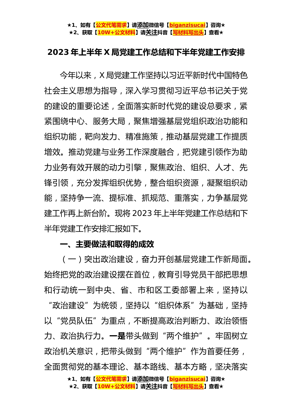 ★1、如有【公文代笔需求】请添加微信号【biganzisucai】咨询★★2、获取【10W+公文材料】请关注抖音【写材料写出头】查看★2023年上半年X局党建工作总结和下半年党建工作安排今年以来,X局党建工作坚持以习近平新时代中国特色社会主义思想为指导,深入学习贯彻习近平总书记关于党的建设的重要论述,全面落实新时代党的建设总要求,紧紧围绕中心、服务大局,聚焦增强基层党组织政治功能和组织功能,靶向发力、精准施策,推动基层党建工作提质增效。推动党建与业务工作深度融合,把党建引领作为助力业务有效开展的动力引擎,聚焦政治、组织、人才、先锋引领,充分发挥组织优势,整合组织资源,凝聚组织动能,坚持争一流、提标准、抓规范、重落实,力争基层党建工作再上新台阶。现将2023年上半年党建工作总结和下半...