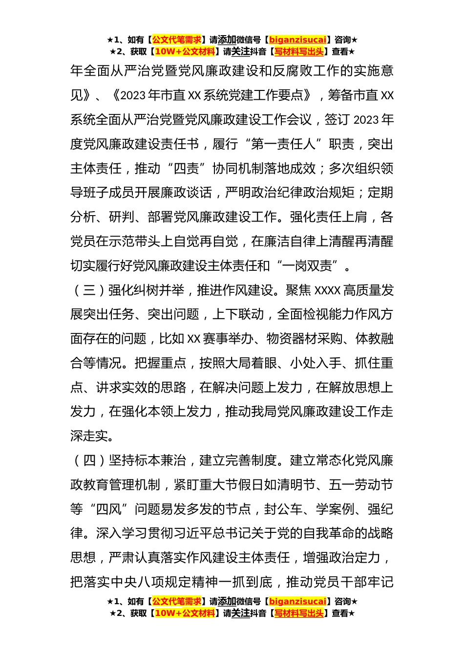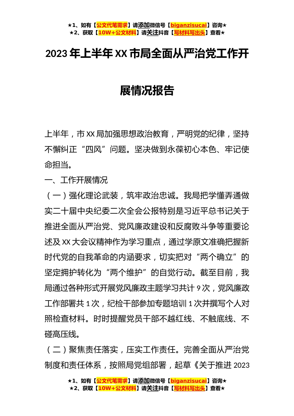 ★1、如有【公文代笔需求】请添加微信号【biganzisucai】咨询★★2、获取【10W+公文材料】请关注抖音【写材料写出头】查看★2023年上半年XX市局全面从严治党工作开展情况报告上半年,市XX局加强思想政治教育,严明党的纪律,坚持不懈纠正“四风”问题。坚决做到永葆初心本色、牢记使命担当。一、工作开展情况(一)强化理论武装,筑牢政治忠诚。我局把学懂弄通做实二十届中央纪委二次全会公报特别是习近平总书记关于推进全面从严治党、党风廉政建设和反腐败斗争等重要论述及XX大会议精神作为学习重点,通过学原文准确把握新时代党的自我革命的内涵要求,切实把对“两个确立”的坚定拥护转化为“两个维护”的自觉行动。截至目前,我局通过各种形式开展党风廉政主题学习共计9次,党风廉政工作部署共1次,纪检干部参...