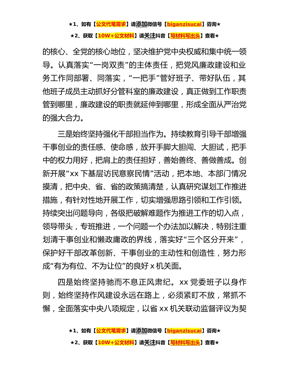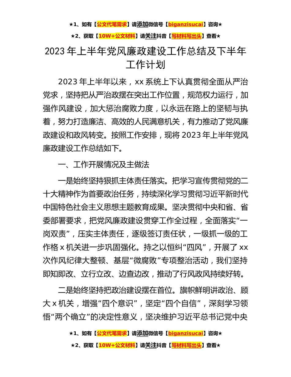 ★1、如有【公文代笔需求】请添加微信号【biganzisucai】咨询★★2、获取【10W+公文材料】请关注抖音【写材料写出头】查看★2023年上半年党风廉政建设工作总结及下半年工作计划2023年上半年以来,xx系统上下认真贯彻全面从严治党求,坚持把从严治政摆在突出工作位置,规范权力运行,加强作风建设,加大惩治腐败力度,以永远在路上的坚韧与执着,努力打造廉洁、高效的人民满意机关,有力推动了党风廉政建设和政风转变。按照工作安排,现将2023年上半年党风廉政建设工作总结如下。一、工作开展情况及主做法一是始终坚持狠抓主体责任落实。把学习宣传贯彻党的二十大精神作为首要政治任务,持续深化学习贯彻习近平新时代中国特色社会主义思想主题教育成果。坚决贯彻中央和省、省委部署要求“,把党风廉政建设贯穿工作...