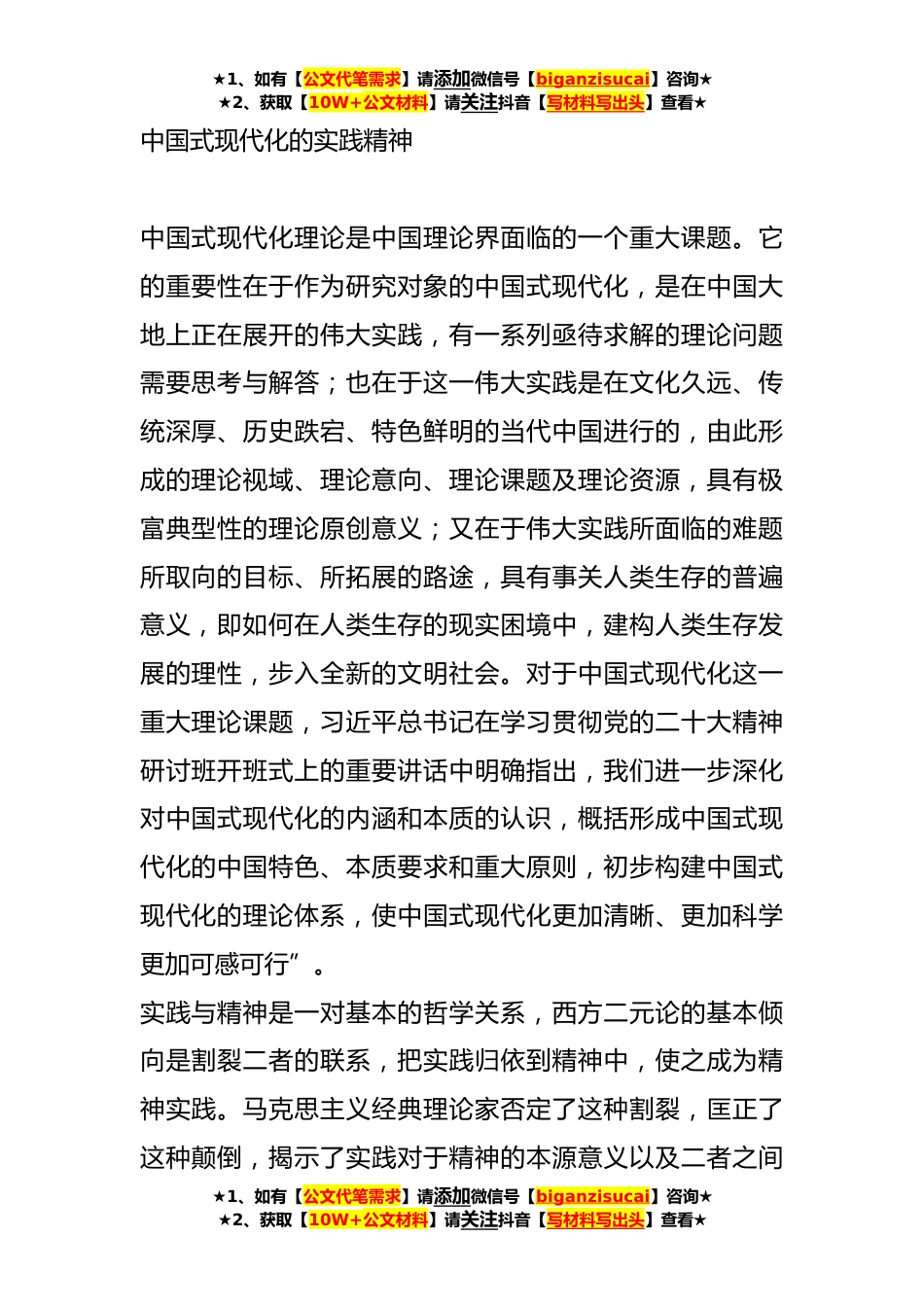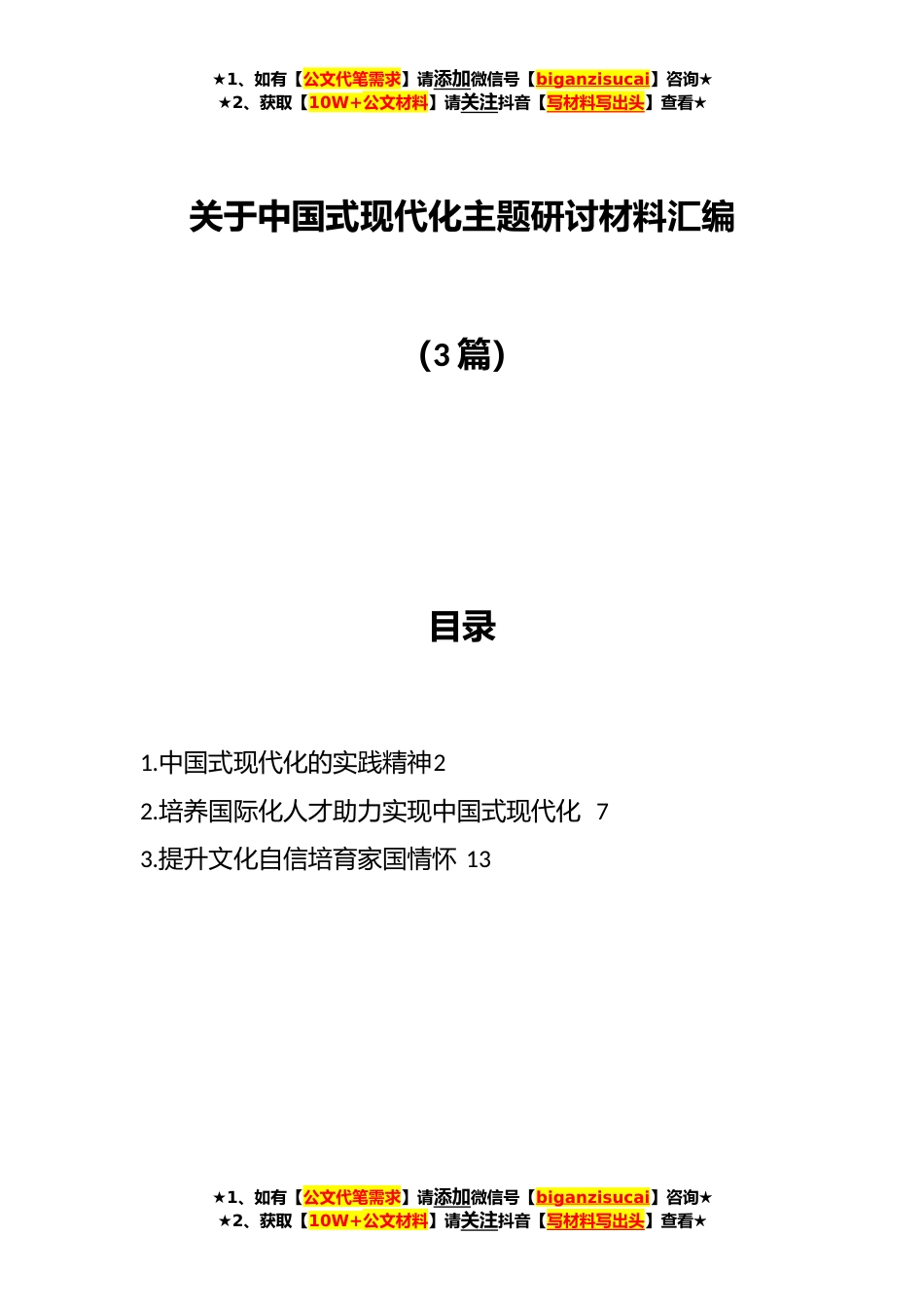 ★1、如有【公文代笔需求】请添加微信号【biganzisucai】咨询★★2、获取【10W+公文材料】请关注抖音【写材料写出头】查看★关于中国式现代化主题研讨材料汇编(3篇)目录1.中国式现代化的实践精神22.培养国际化人才助力实现中国式现代化73.提升文化自信培育家国情怀13★1、如有【公文代笔需求】请添加微信号【biganzisucai】咨询★★2、获取【10W+公文材料】请关注抖音【写材料写出头】查看★★1、如有【公文代笔需求】请添加微信号【biganzisucai】咨询★★2、获取【10W+公文材料】请关注抖音【写材料写出头】查看★中国式现代化的实践精神中国式现代化理论是中国理论界面临的一个重大课题。它的重要性在于作为研究对象的中国式现代化,是在中国大地上正在展开的伟大实践,有一系列亟待求解的理论问题需要思考与...