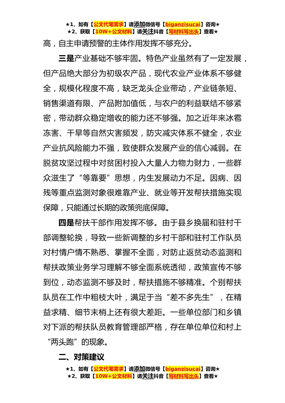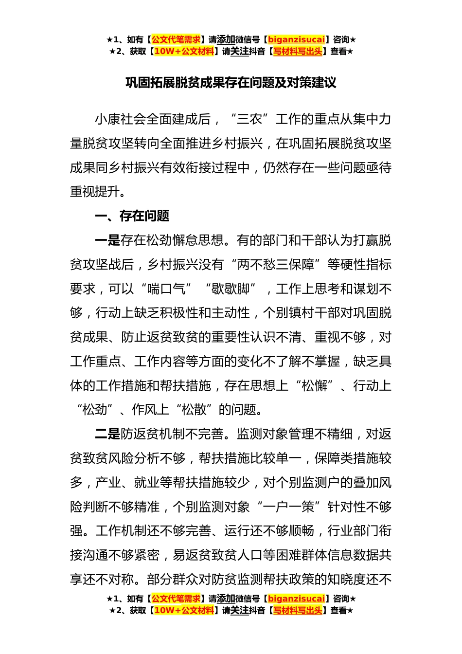 ★1、如有【公文代笔需求】请添加微信号【biganzisucai】咨询★★2、获取【10W+公文材料】请关注抖音【写材料写出头】查看★巩固拓展脱贫成果存在问题及对策建议小康社会全面建成后,“三农”工作的重点从集中力量脱贫攻坚转向全面推进乡村振兴,在巩固拓展脱贫攻坚成果同乡村振兴有效衔接过程中,仍然存在一些问题亟待重视提升。一、存在问题一是存在松劲懈怠思想。有的部门和干部认为打赢脱贫攻坚战后,乡村振兴没有“两不愁三保障”等硬性指标要求,可以“喘口气”“歇歇脚”,工作上思考和谋划不够,行动上缺乏积极性和主动性,个别镇村干部对巩固脱贫成果、防止返贫致贫的重要性认识不清、重视不够,对工作重点、工作内容等方面的变化不了解不掌握,缺乏具体的工作措施和帮扶措施,存在思想上“松懈”、行动...