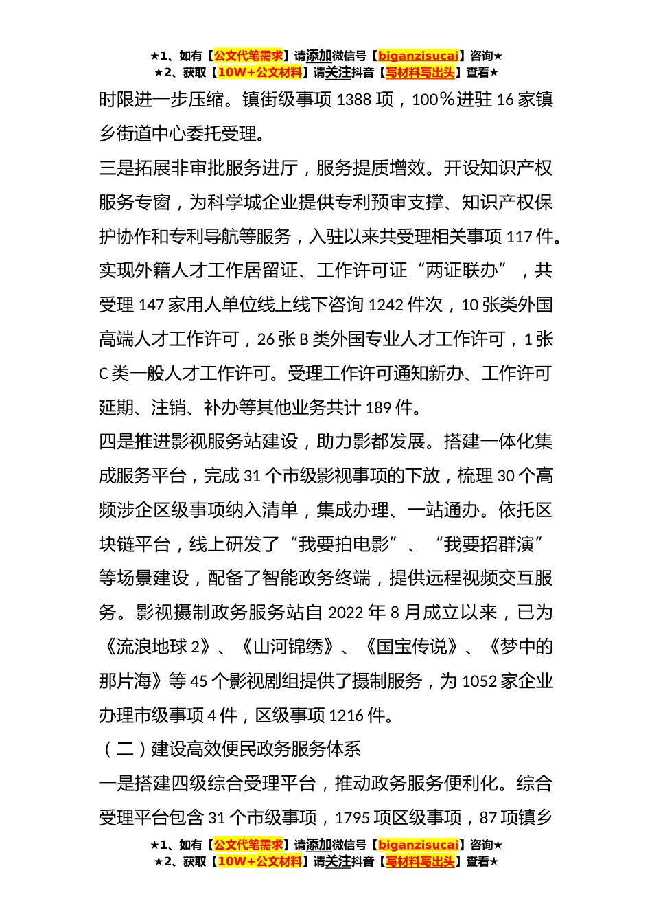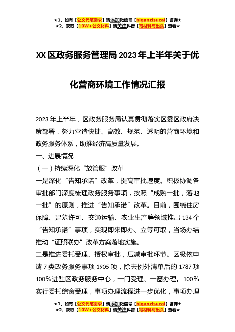 ★1、如有【公文代笔需求】请添加微信号【biganzisucai】咨询★★2、获取【10W+公文材料】请关注抖音【写材料写出头】查看★XX区政务服务管理局2023年上半年关于优化营商环境工作情况汇报2023年上半年,区政务服务局认真贯彻落实区委区政府决策部署,努力营造快捷、高效、规范、透明的营商环境和政务服务体系,助推经济高质量发展。一、进展情况(一)持续深化“放管服”改革一是深化“告知承诺”改革,提高审批速度。积极协调各审批部门深度梳理政务服务事项,按照“成熟一批,落地一批”的原则,推进“告知承诺”改革。目前,围绕住房保障、建筑许可、交通运输、农业生产等领域推出134个“告知承诺”事项,实现即来即办、立等可取,当场办结推动“证照联办”改革方案落地实施。二是推进委托受理、授权审批,压减...