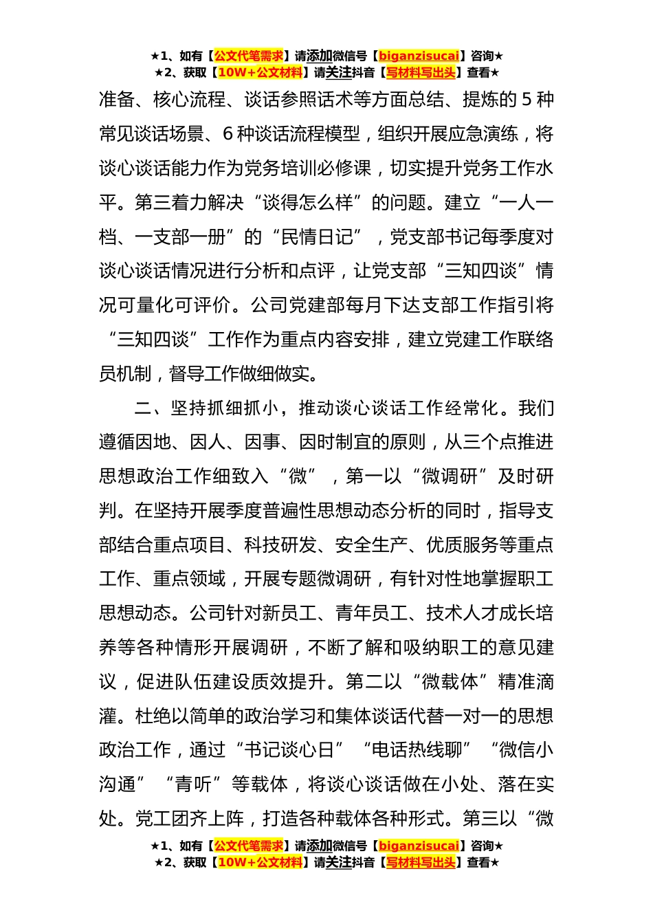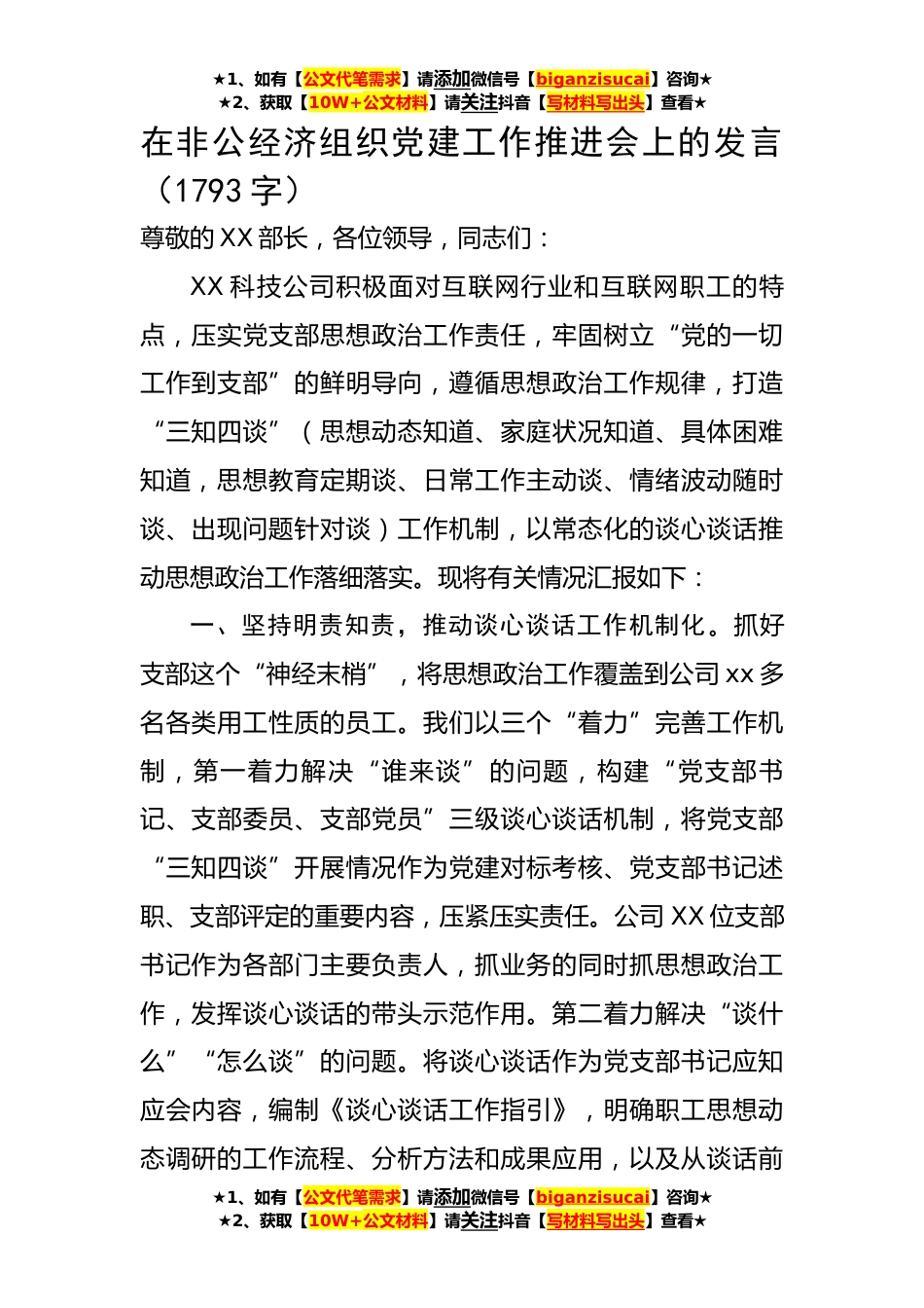 ★1、如有【公文代笔需求】请添加微信号【biganzisucai】咨询★★2、获取【10W+公文材料】请关注抖音【写材料写出头】查看★在非公经济组织党建工作推进会上的发言(1793字)尊敬的XX部长,各位领导,同志们:XX科技公司积极面对互联网行业和互联网职工的特点,压实党支部思想政治工作责任,牢固树立“党的一切工作到支部”的鲜明导向,遵循思想政治工作规律,打造“三知四谈”(思想动态知道、家庭状况知道、具体困难知道,思想教育定期谈、日常工作主动谈、情绪波动随时谈、出现问题针对谈)工作机制,以常态化的谈心谈话推动思想政治工作落细落实。现将有关情况汇报如下:一、坚持明责知责,推动谈心谈话工作机制化。抓好支部这个“神经末梢”,将思想政治工作覆盖到公司xx多名各类用工性质的员工。我们以三个...