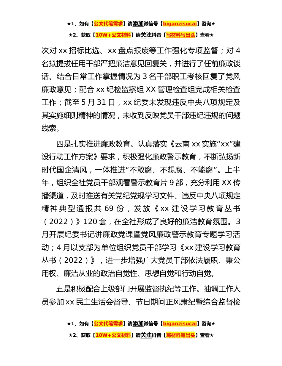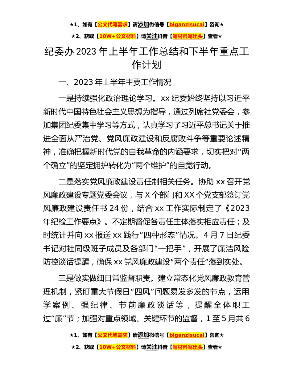 ★1、如有【公文代笔需求】请添加微信号【biganzisucai】咨询★★2、获取【10W+公文材料】请关注抖音【写材料写出头】查看★纪委办2023年上半年工作总结和下半年重点工作计划一、2023年上半年主要工作情况一是持续强化政治理论学习。xx纪委始终坚持以习近平新时代中国特色社会主义思想为指导,通过列席社党委会,参加集团纪委集中学习等方式,认真学习了习近平总书记关于推进全面从严治党、党风廉政建设和反腐败斗争等重要论述精“神,准确把握新时代党的自我革命的内涵要求,切实把对两”“”个确立的坚定拥护转化为两个维护的自觉行动。二是落实党风廉政建设责任制相关任务。协助xx召开党风廉政建设专题党委会议,与X个部门和XX个党支部签订党风廉政建设责任书24份,结合xx工作实际制定了《2023年纪检工作要点》...