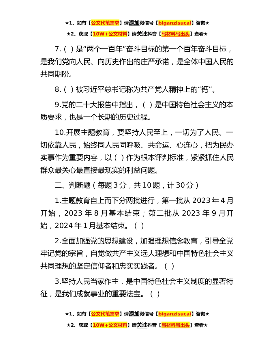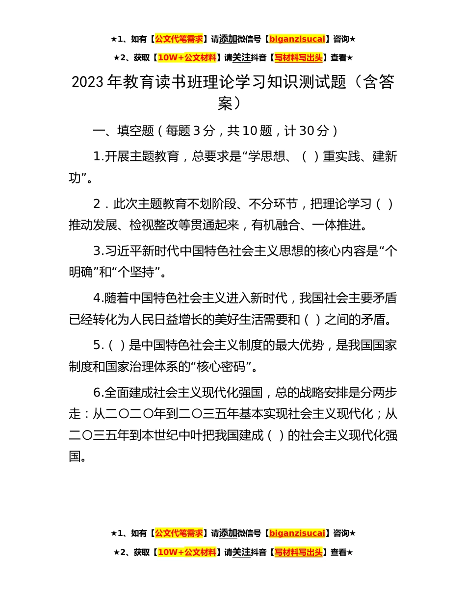 ★1、如有【公文代笔需求】请添加微信号【biganzisucai】咨询★★2、获取【10W+公文材料】请关注抖音【写材料写出头】查看★2023年教育读书班理论学习知识测试题(含答案)一、填空题(每题3分,共10题,计30分)1.“开展主题教育,总要求是学思想、()重实践、建新”功。2.此次主题教育不划阶段、不分环节,把理论学习()推动发展、检视整改等贯通起来,有机融合、一体推进。3.“习近平新时代中国特色社会主义思想的核心内容是个”“”明确和个坚持。4.随着中国特色社会主义进入新时代,我国社会主要矛盾已经转化为人民日益增长的美好生活需要和()之间的矛盾。5.()是中国特色社会主义制度的最大优势,是我国国家“”制度和国家治理体系的核心密码。6.全面建成社会主义现代化强国,总的战略安排是分两步走...