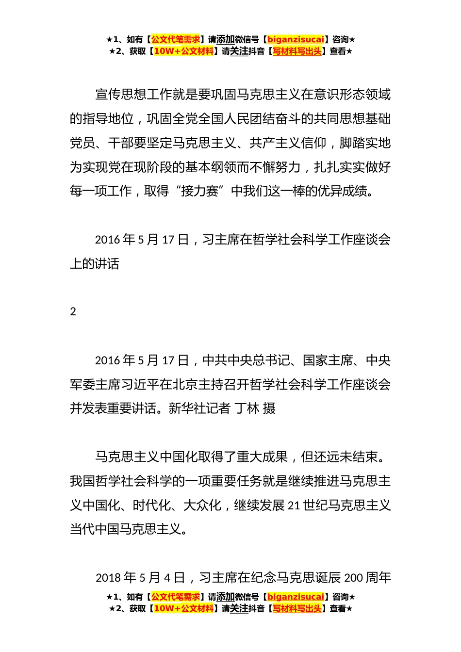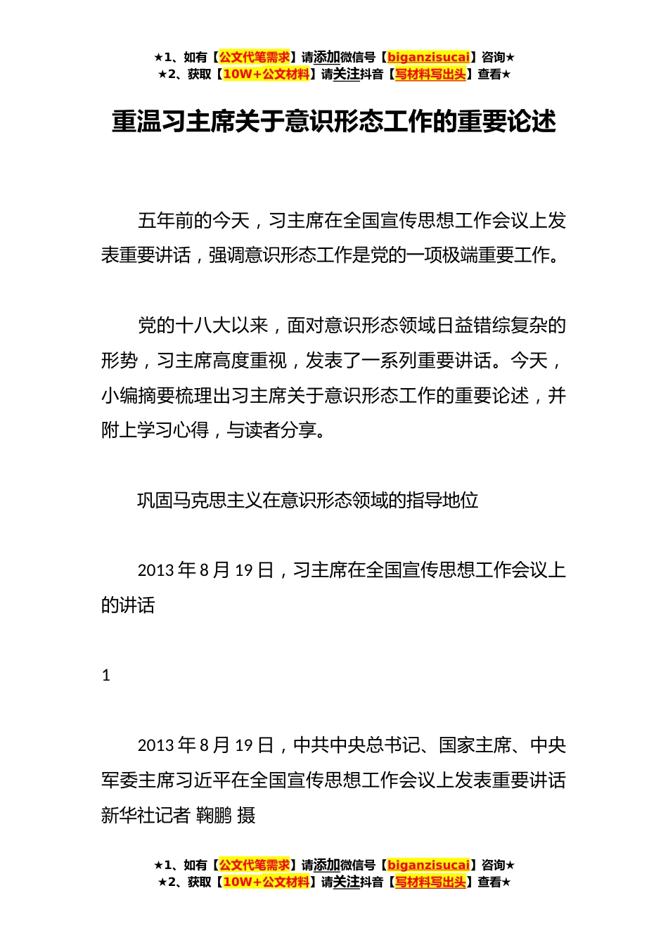 ★1、如有【公文代笔需求】请添加微信号【biganzisucai】咨询★★2、获取【10W+公文材料】请关注抖音【写材料写出头】查看★重温习主席关于意识形态工作的重要论述五年前的今天,习主席在全国宣传思想工作会议上发表重要讲话,强调意识形态工作是党的一项极端重要工作。党的十八大以来,面对意识形态领域日益错综复杂的形势,习主席高度重视,发表了一系列重要讲话。今天,小编摘要梳理出习主席关于意识形态工作的重要论述,并附上学习心得,与读者分享。巩固马克思主义在意识形态领域的指导地位2013年8月19日,习主席在全国宣传思想工作会议上的讲话12013年8月19日,中共中央总书记、国家主席、中央军委主席习近平在全国宣传思想工作会议上发表重要讲话新华社记者鞠鹏摄★1、如有【公文代笔需求】请添加微信号【b...