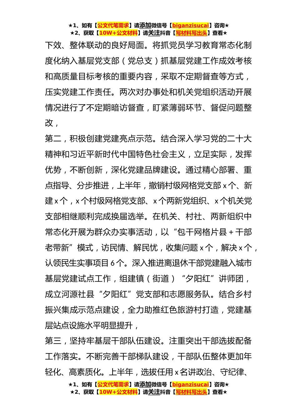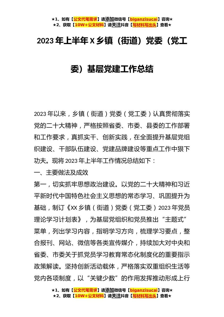 ★1、如有【公文代笔需求】请添加微信号【biganzisucai】咨询★★2、获取【10W+公文材料】请关注抖音【写材料写出头】查看★2023年上半年X乡镇(街道)党委(党工委)基层党建工作总结2023年以来,乡镇(街道)党委(党工委)认真贯彻落实党的二十大精神,严格按照省委、市委、县委的工作部署和工作要求,真抓实干、创新实践,在全面提升基层党组织建设、干部队伍建设、党建品牌建设等重点工作中狠下功夫。现将2023年上半年工作情况总结如下:一、主要做法及成效第一,切实抓牢思想政治建设。以党的二十大精神和习近平新时代中国特色社会主义思想的常态学习、巩固提升为基础,制订《XX乡镇(街道)党委(党工委)2023年党员理论学习计划表》,为基层党组织和党员推出“主题式”菜单,列出学习内容,指明学习方向,...