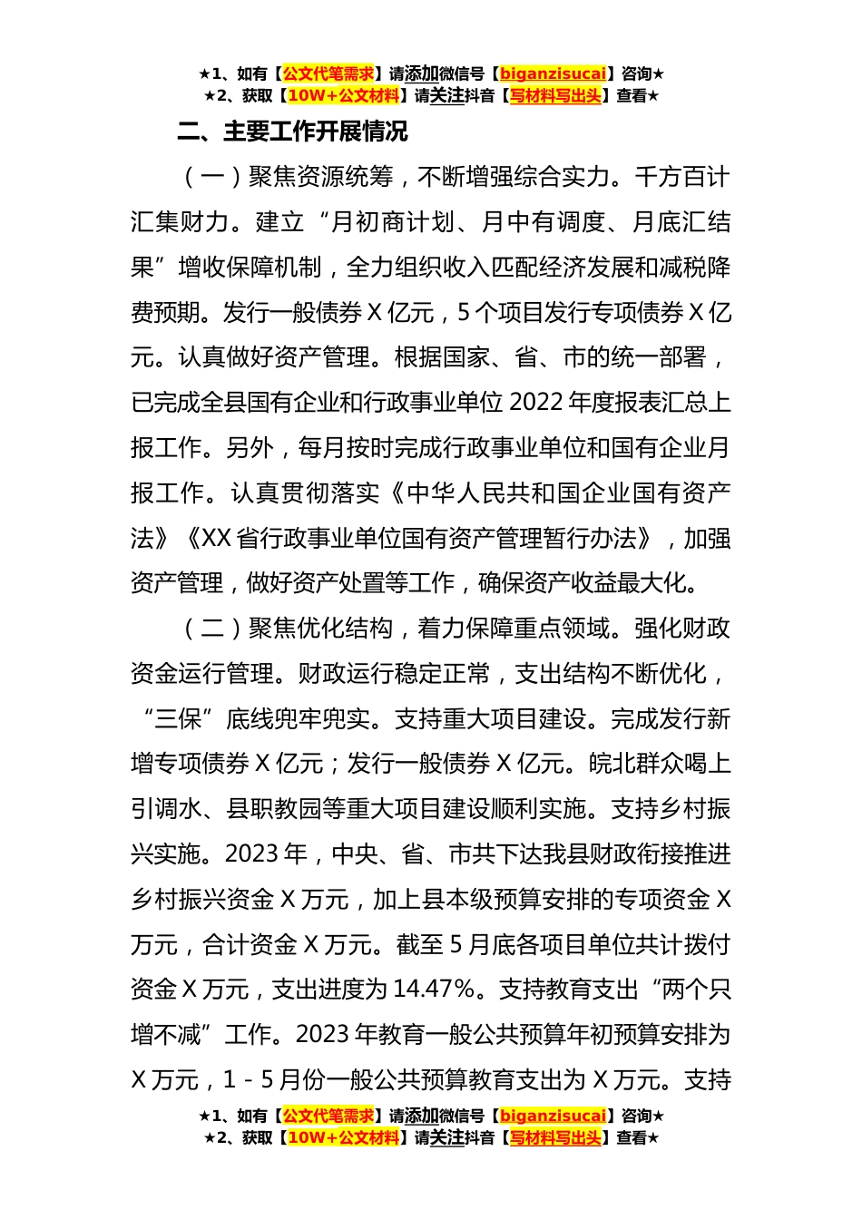 ★1、如有【公文代笔需求】请添加微信号【biganzisucai】咨询★★2、获取【10W+公文材料】请关注抖音【写材料写出头】查看★XX县财政局2023年上半年重点工作完成情况2023年以来,全县财政工作坚持以习近平新时代中国特色社会主义思想为指导,认真贯彻党的十九大、XX大精神,完整、准确、全面贯彻新发展理念,统筹疫情防控和经济社会发展,统筹发展和安全,扎实做好“六稳”“六保”工作,发挥财政职能,统筹财政资源,强化预算管理提高财政资金使用效率,全面完成各项财政工作。一、主要指标运行情况(一)财政收支完成情况。一季度,我县财政收入实现X万元,总量第三,较上年同比增长3.5%。地方收入完成X万元,较上年同比增长3.4%,总量第三,增速第五。财政支出X万元,较上年增长10.8%,总量第二,增速第三。...