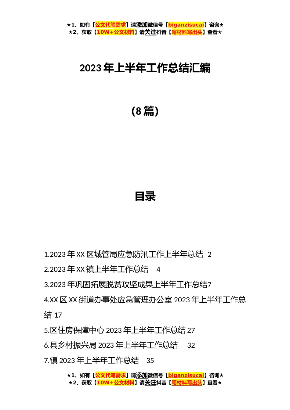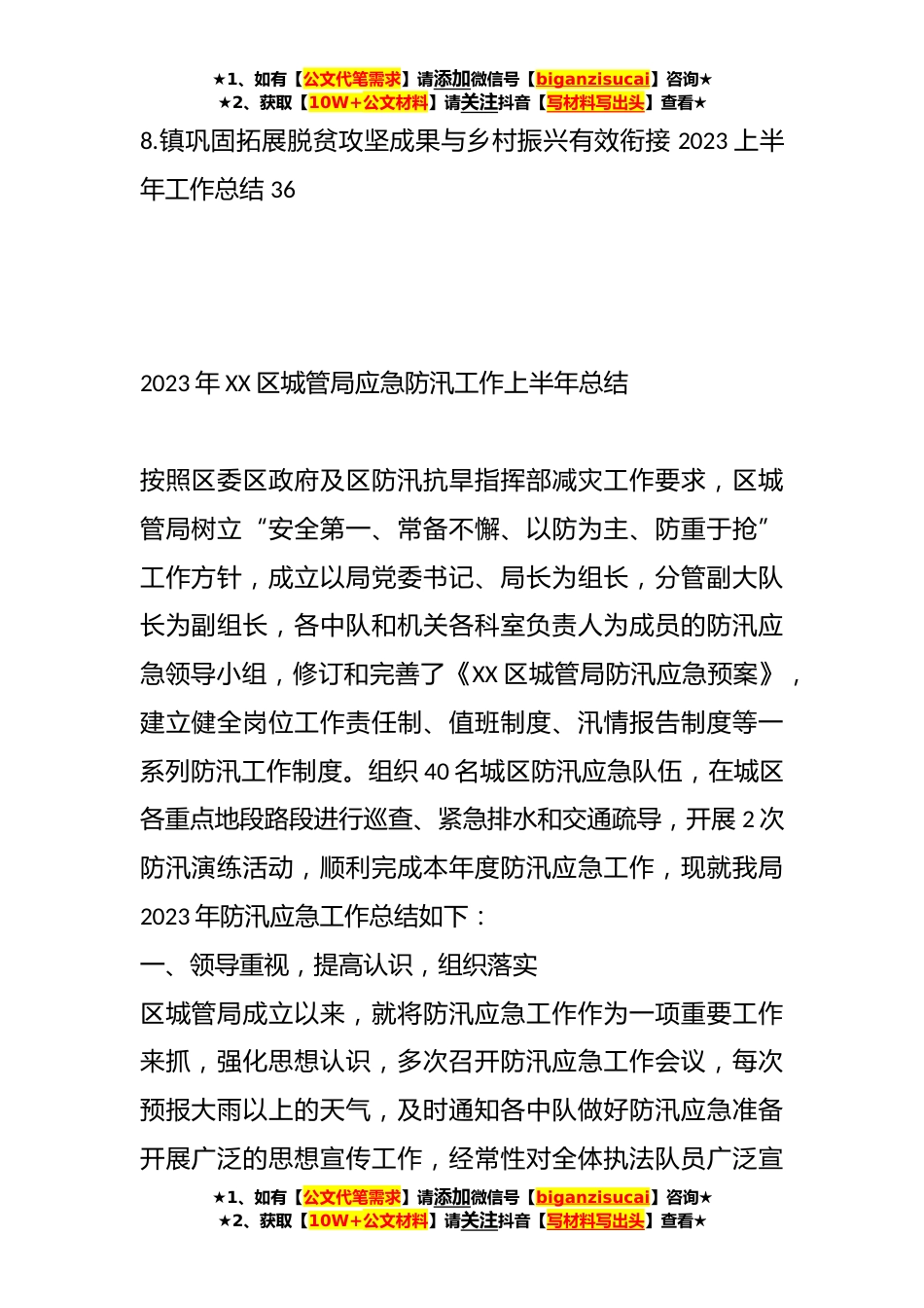 ★1、如有【公文代笔需求】请添加微信号【biganzisucai】咨询★★2、获取【10W+公文材料】请关注抖音【写材料写出头】查看★2023年上半年工作总结汇编(8篇)目录1.2023年XX区城管局应急防汛工作上半年总结22.2023年XX镇上半年工作总结43.2023年巩固拓展脱贫攻坚成果上半年工作总结74.XX区XX街道办事处应急管理办公室2023年上半年工作总结175.区住房保障中心2023年上半年工作总结276.县乡村振兴局2023年上半年工作总结327.镇2023年上半年工作总结35★1、如有【公文代笔需求】请添加微信号【biganzisucai】咨询★★2、获取【10W+公文材料】请关注抖音【写材料写出头】查看★★1、如有【公文代笔需求】请添加微信号【biganzisucai】咨询★★2、获取【10W+公文材料】请关注抖音【写材料写出头】查看★8.镇巩固拓展脱...