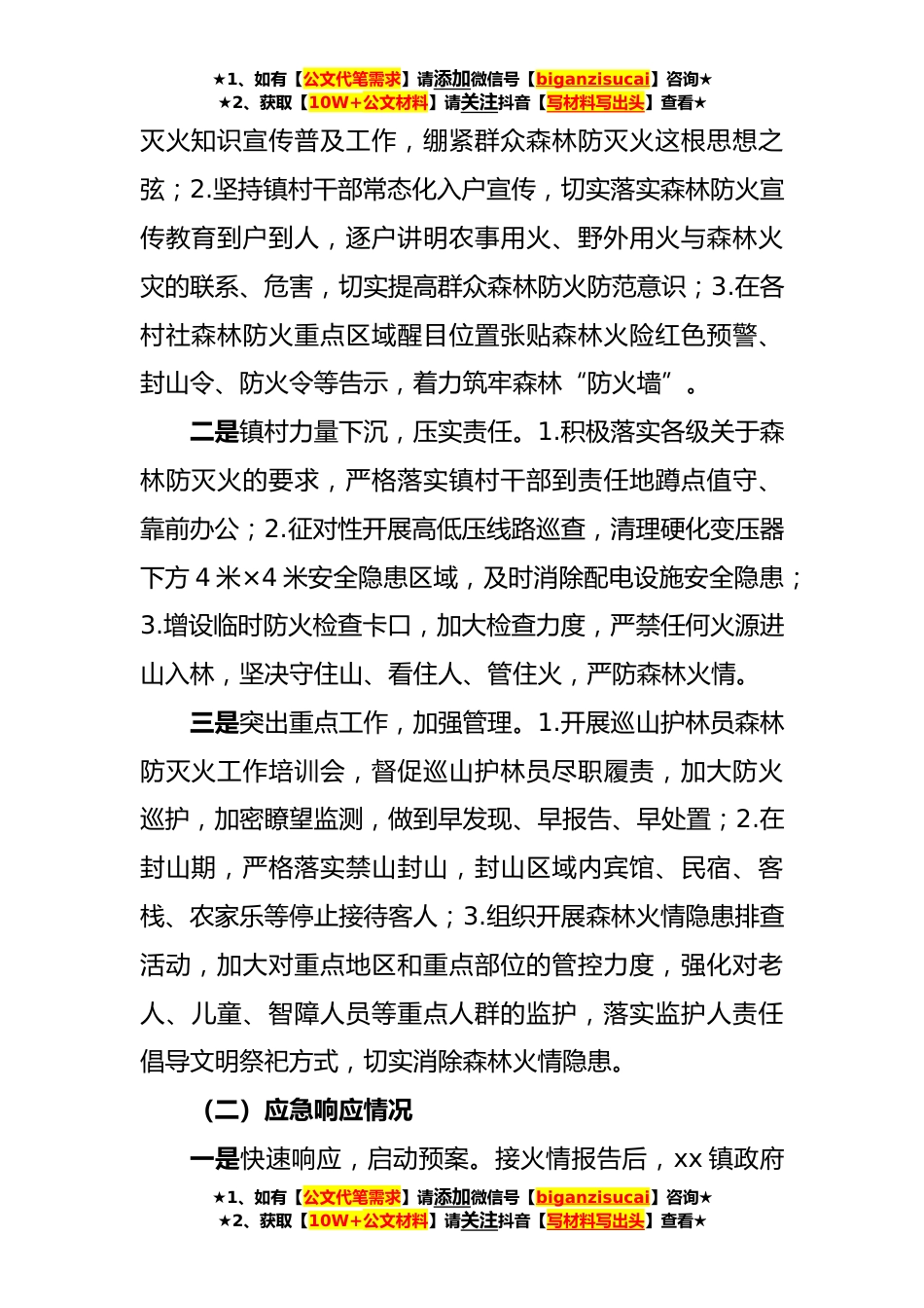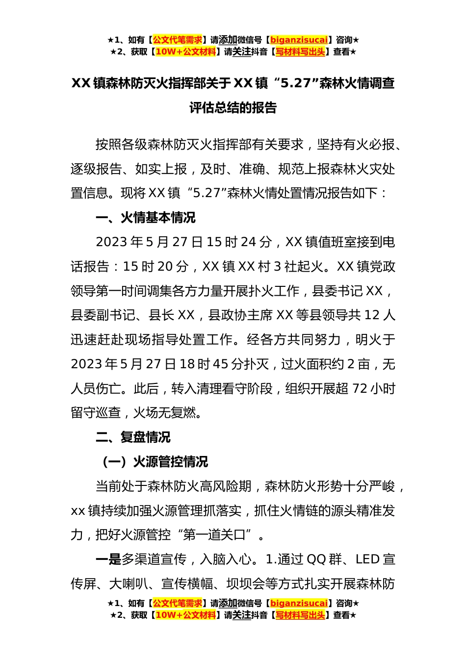 ★1、如有【公文代笔需求】请添加微信号【biganzisucai】咨询★★2、获取【10W+公文材料】请关注抖音【写材料写出头】查看★XX镇森林防灭火指挥部关于XX镇“5.27”森林火情调查评估总结的报告按照各级森林防灭火指挥部有关要求,坚持有火必报、逐级报告、如实上报,及时、准确、规范上报森林火灾处置信息。现将XX镇“5.27”森林火情处置情况报告如下:一、火情基本情况2023年5月27日15时24分,XX镇值班室接到电话报告:15时20分,XX镇XX村3社起火。XX镇党政领导第一时间调集各方力量开展扑火工作,县委书记XX,县委副书记、县长XX,县政协主席XX等县领导共12人迅速赶赴现场指导处置工作。经各方共同努力,明火于2023年5月27日18时45分扑灭,过火面积约2亩,无人员伤亡。此后,转入清理看守阶段,组织开展超72小时...