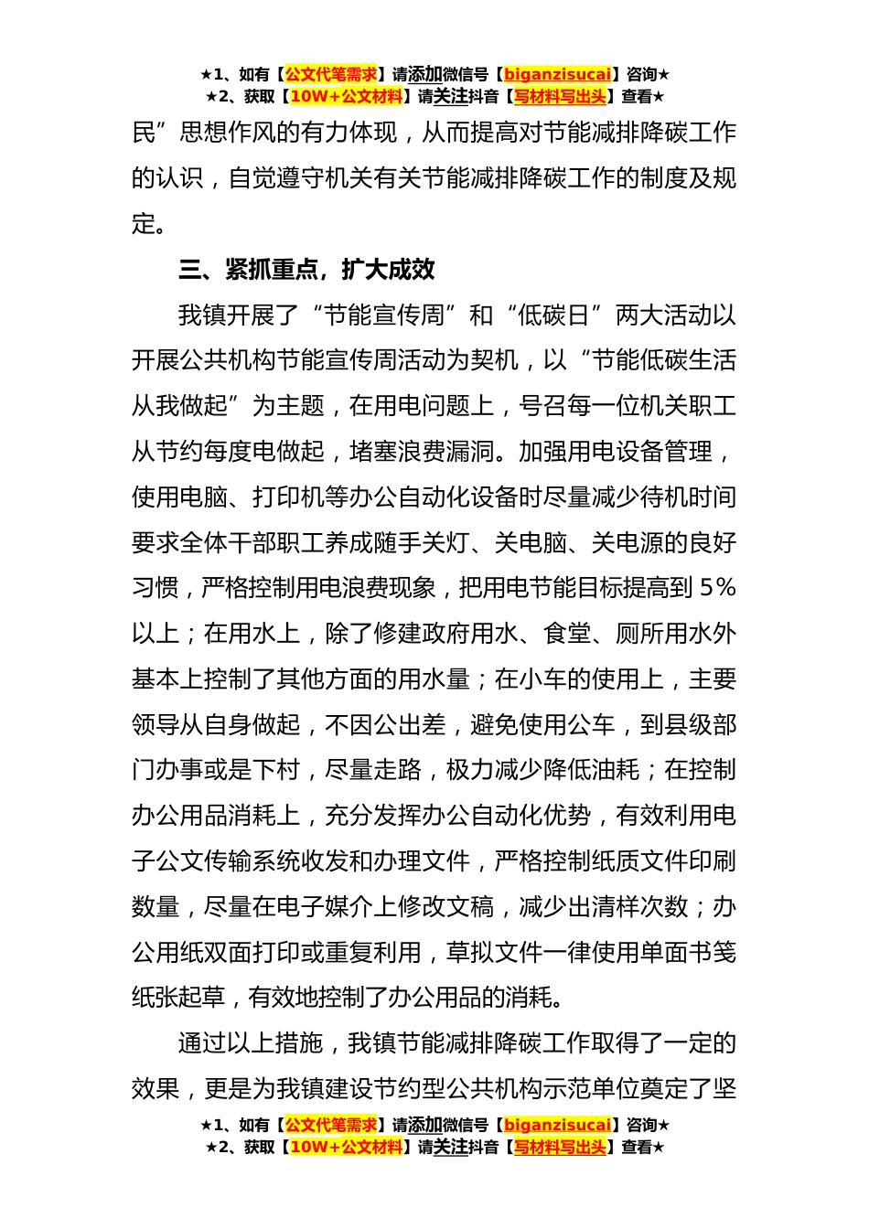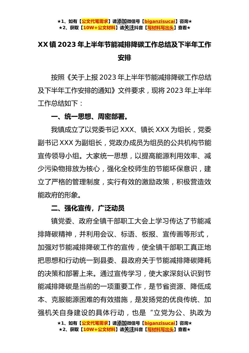 ★1、如有【公文代笔需求】请添加微信号【biganzisucai】咨询★★2、获取【10W+公文材料】请关注抖音【写材料写出头】查看★XX镇2023年上半年节能减排降碳工作总结及下半年工作安排按照《关于上报2023年上半年节能减排降碳工作总结及下半年工作安排的通知》文件要求,现将2023年上半年工作总结如下:一、统一思想、周密部署。我镇成立了以党委书记XXX、镇长XXX为组长,党委副书记XXX为副组长,党政办成员为组员的公共机构节能宣传领导小组。大家统一思想,以提高能源利用效率、减少污染物排放为核心,强化全校师生的节能环保意识,建立了严格的管理制度,实行有效的激励政策,积极营造效能政府的形象。二、强化宣传,广泛动员镇党委、政府全镇干部职工大会上学习传达了节能减排降碳精神,并利用会议、标语、板报、...