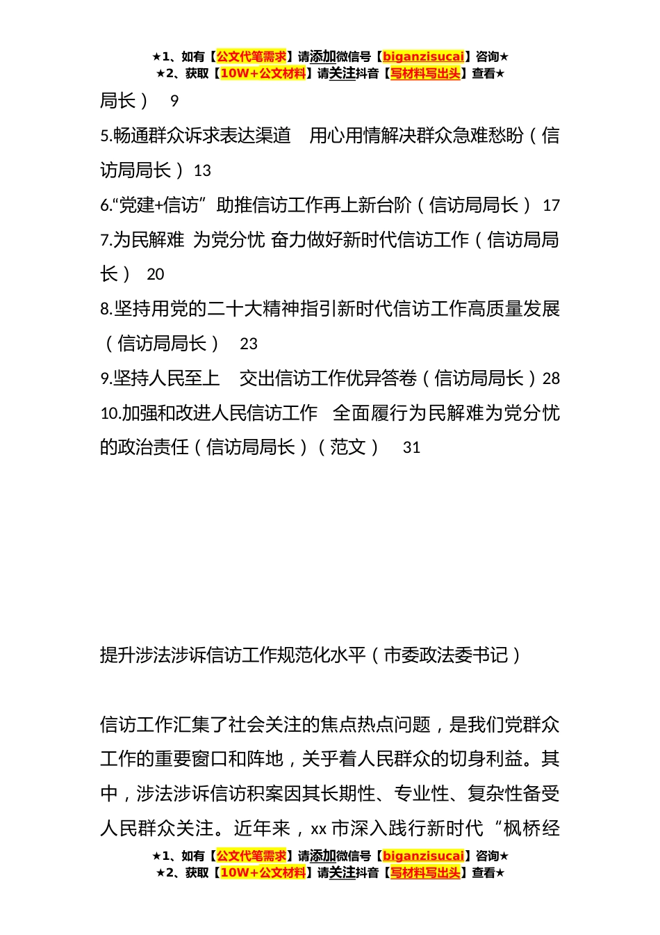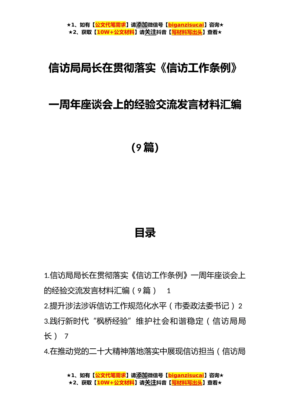 ★1、如有【公文代笔需求】请添加微信号【biganzisucai】咨询★★2、获取【10W+公文材料】请关注抖音【写材料写出头】查看★信访局局长在贯彻落实《信访工作条例》一周年座谈会上的经验交流发言材料汇编(9篇)目录1.信访局局长在贯彻落实《信访工作条例》一周年座谈会上的经验交流发言材料汇编(9篇)12.提升涉法涉诉信访工作规范化水平(市委政法委书记)23.践行新时代“枫桥经验”维护社会和谐稳定(信访局局长)74.在推动党的二十大精神落地落实中展现信访担当(信访局★1、如有【公文代笔需求】请添加微信号【biganzisucai】咨询★★2、获取【10W+公文材料】请关注抖音【写材料写出头】查看★★1、如有【公文代笔需求】请添加微信号【biganzisucai】咨询★★2、获取【10W+公文材料】请关注抖音【写材料写出头...