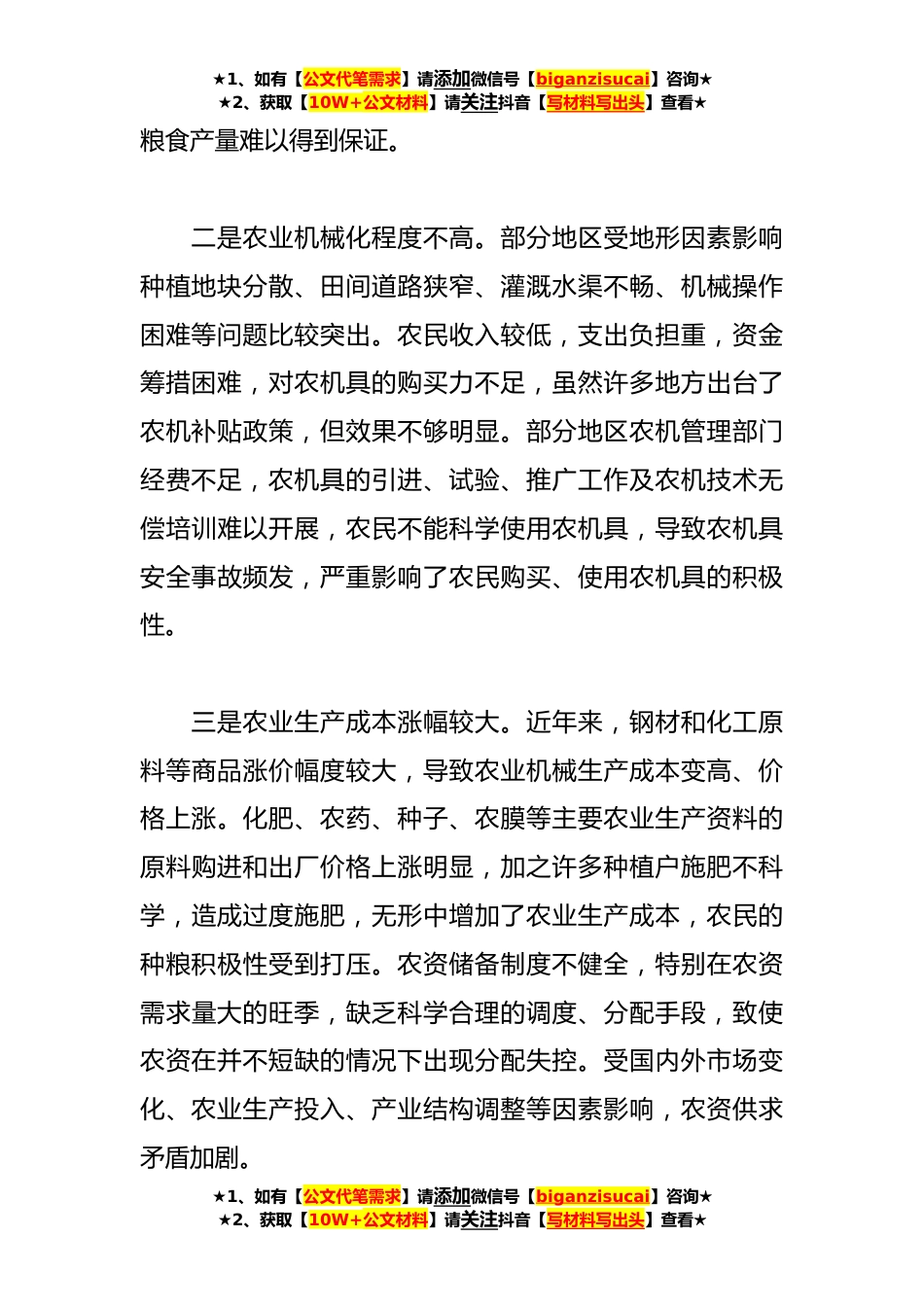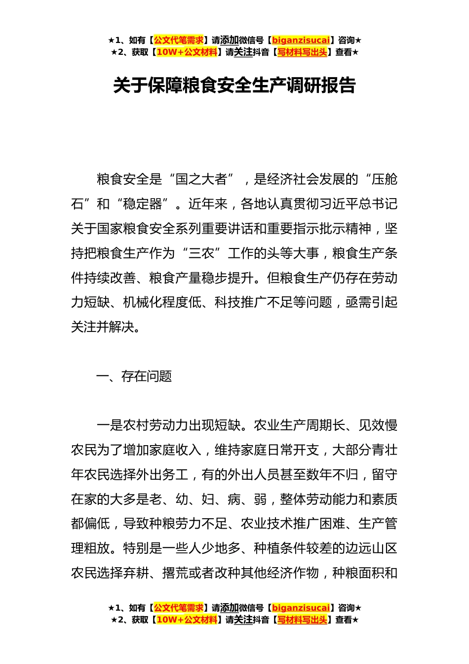 ★1、如有【公文代笔需求】请添加微信号【biganzisucai】咨询★★2、获取【10W+公文材料】请关注抖音【写材料写出头】查看★关于保障粮食安全生产调研报告粮食安全是“国之大者”,是经济社会发展的“压舱石”和“稳定器”。近年来,各地认真贯彻习近平总书记关于国家粮食安全系列重要讲话和重要指示批示精神,坚持把粮食生产作为“三农”工作的头等大事,粮食生产条件持续改善、粮食产量稳步提升。但粮食生产仍存在劳动力短缺、机械化程度低、科技推广不足等问题,亟需引起关注并解决。一、存在问题一是农村劳动力出现短缺。农业生产周期长、见效慢农民为了增加家庭收入,维持家庭日常开支,大部分青壮年农民选择外出务工,有的外出人员甚至数年不归,留守在家的大多是老、幼、妇、病、弱,整体劳动能力和素质都...