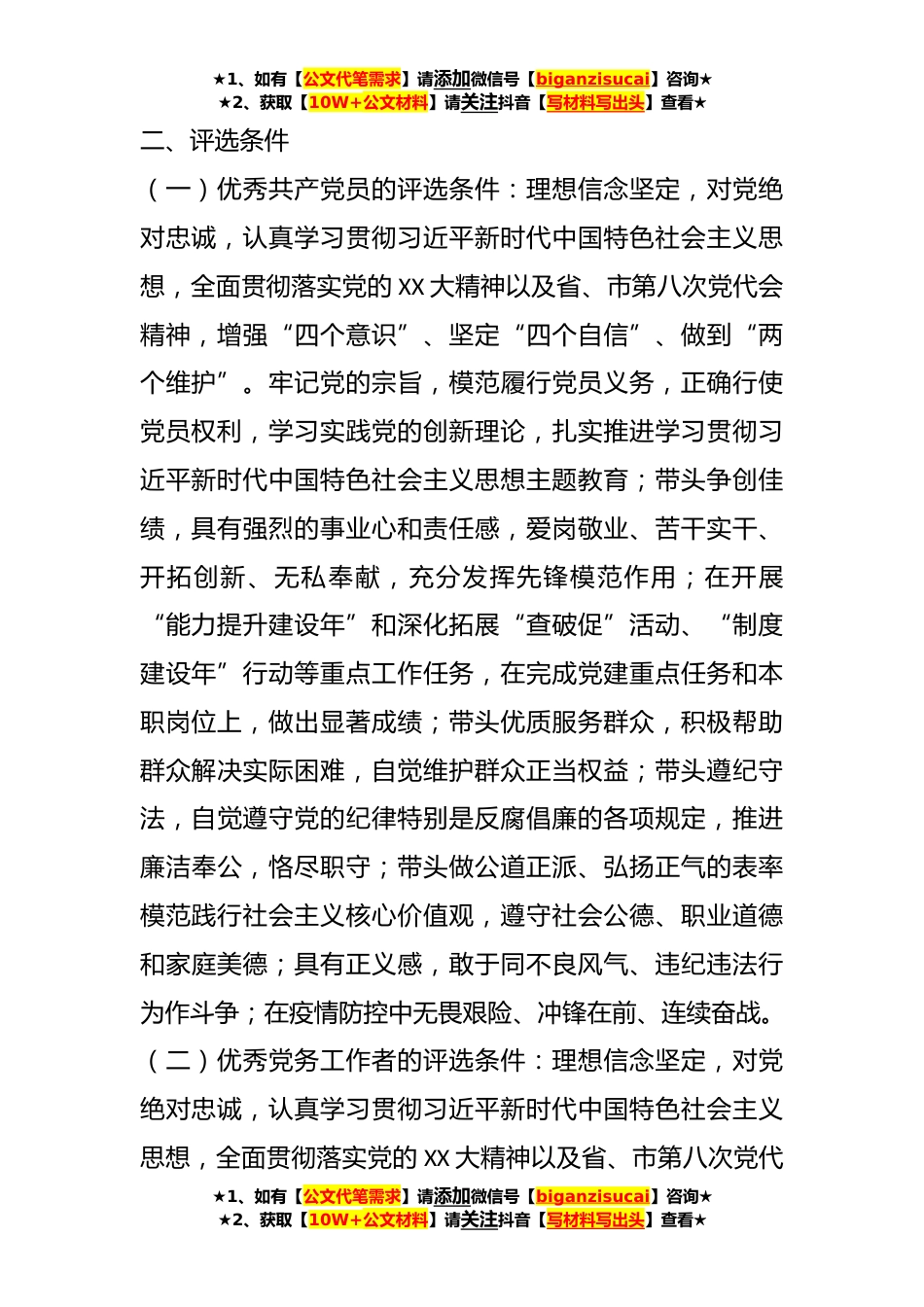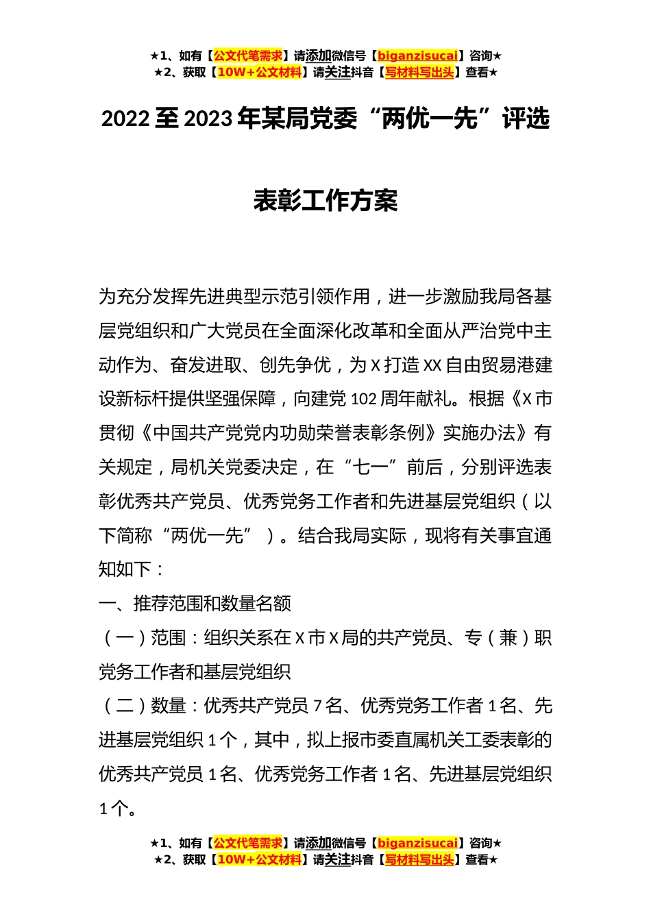 ★1、如有【公文代笔需求】请添加微信号【biganzisucai】咨询★★2、获取【10W+公文材料】请关注抖音【写材料写出头】查看★2022至2023年某局党委“两优一先”评选表彰工作方案为充分发挥先进典型示范引领作用,进一步激励我局各基层党组织和广大党员在全面深化改革和全面从严治党中主动作为、奋发进取、创先争优,为X打造XX自由贸易港建设新标杆提供坚强保障,向建党102周年献礼。根据《X市贯彻《中国共产党党内功勋荣誉表彰条例》实施办法》有关规定,局机关党委决定,在“七一”前后,分别评选表彰优秀共产党员、优秀党务工作者和先进基层党组织(以下简称“两优一先”)。结合我局实际,现将有关事宜通知如下:一、推荐范围和数量名额(一)范围:组织关系在X市X局的共产党员、专(兼)职党务工作者和基层党组...