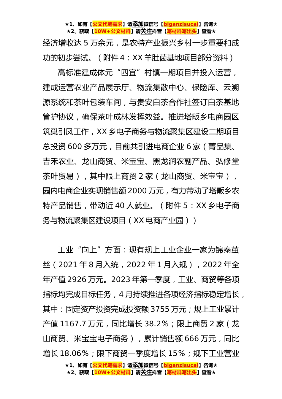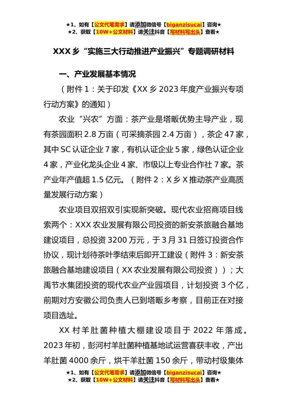 ★1、如有【公文代笔需求】请添加微信号【biganzisucai】咨询★★2、获取【10W+公文材料】请关注抖音【写材料写出头】查看★XXX乡“实施三大行动推进产业振兴”专题调研材料一、产业发展基本情况(附件1:关于印发《XX乡2023年度产业振兴专项行动方案》的通知)农业“兴农”方面:茶产业是塔畈优势主导产业,现有茶园面积2.8万亩(可采摘茶园2.4万亩),茶企47家,其中SC认证企业7家,有机认证企业5家,绿色认证企业4家,产业化龙头企业4家、市级以上专业合作社7家。茶产业年产值超1.5亿元。(附件2:X乡X推动茶产业高质量发展行动方案)农业项目双招双引实现新突破。现代农业招商项目线索两个:XXX农业发展有限公司投资的新安茶旅融合基地建设项目,总投资3200万元,于3月31日签订投资合作协议,现计划待茶叶季结...