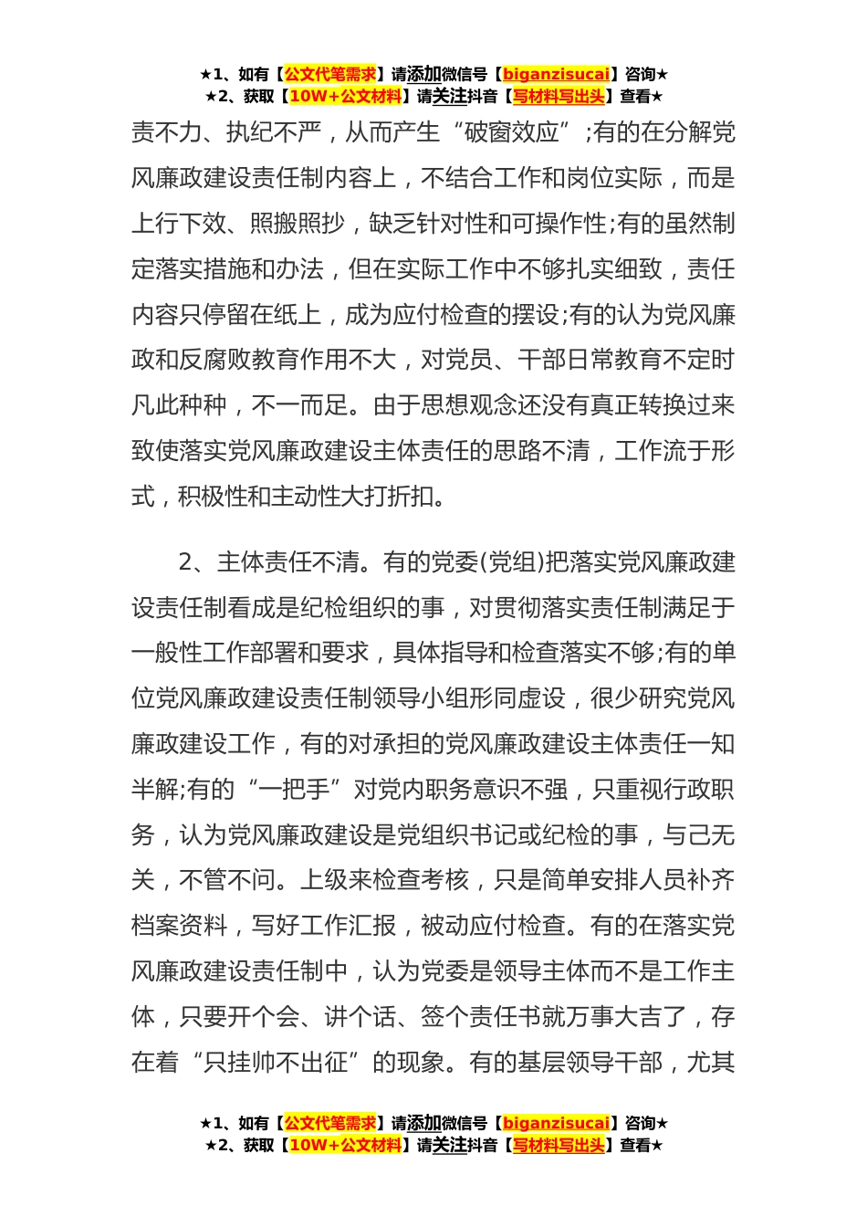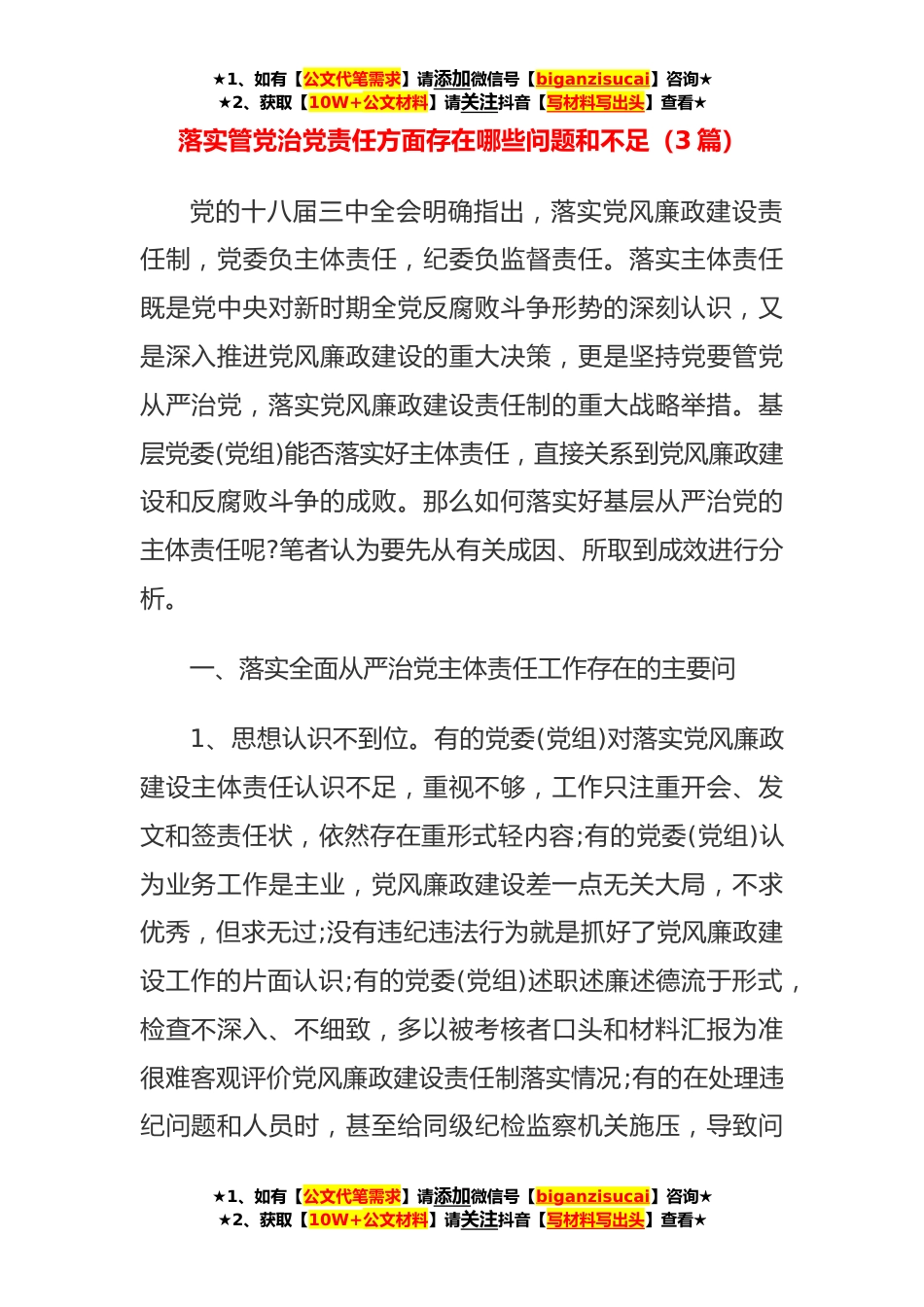 ★1、如有【公文代笔需求】请添加微信号【biganzisucai】咨询★★2、获取【10W+公文材料】请关注抖音【写材料写出头】查看★落实管党治党责任方面存在哪些问题和不足(3篇)党的十八届三中全会明确指出,落实党风廉政建设责任制,党委负主体责任,纪委负监督责任。落实主体责任既是党中央对新时期全党反腐败斗争形势的深刻认识,又是深入推进党风廉政建设的重大决策,更是坚持党要管党从严治党,落实党风廉政建设责任制的重大战略举措。基层党委(党组)能否落实好主体责任,直接关系到党风廉政建设和反腐败斗争的成败。那么如何落实好基层从严治党的主体责任呢?笔者认为要先从有关成因、所取到成效进行分析。一、落实全面从严治党主体责任工作存在的主要问1、思想认识不到位。有的党委(党组)对落实党风廉政建设主体...